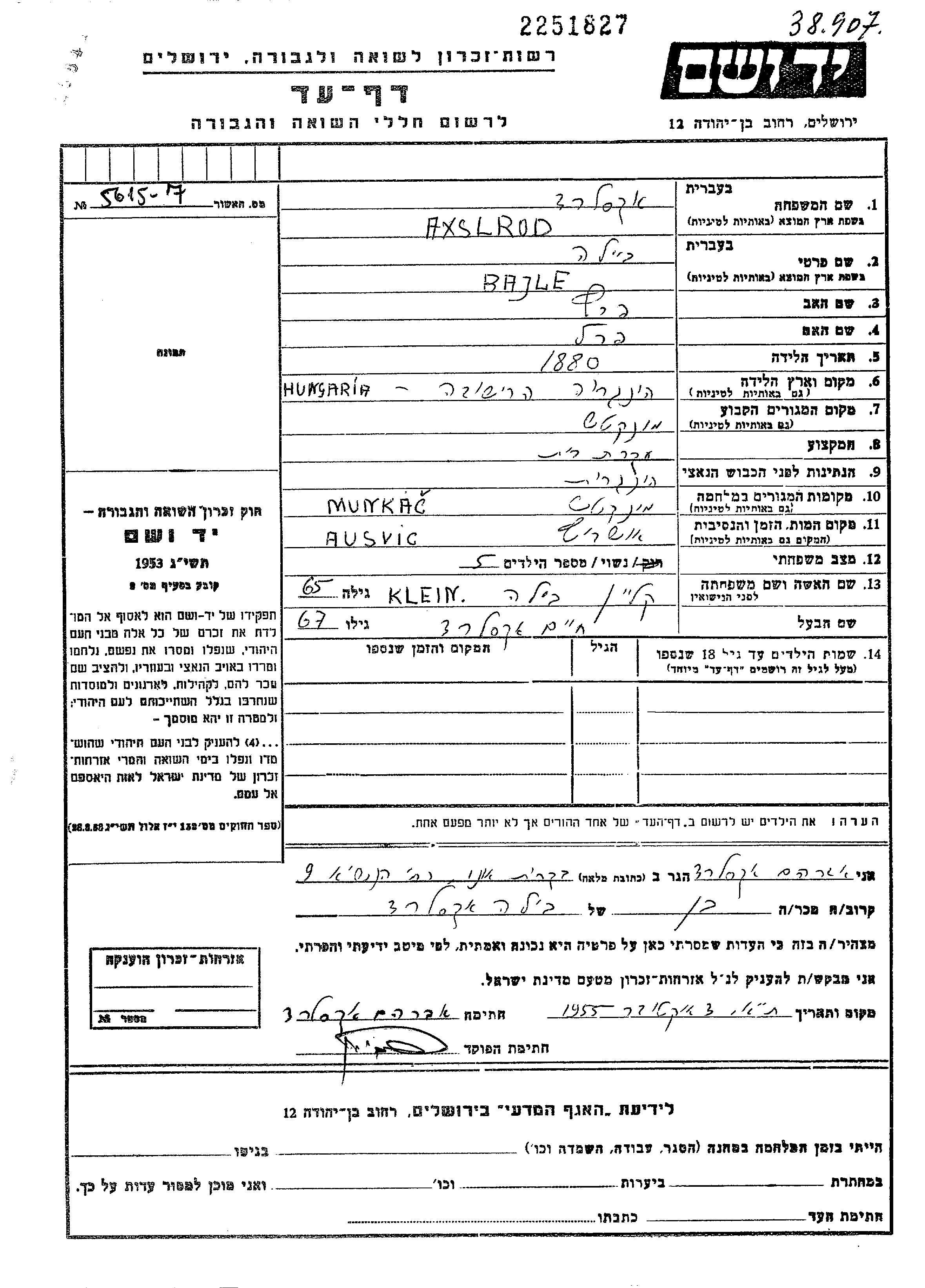 Baila Axelrad, geb. Klein wurde im Jahr 1880 in Hrusovo, Tschechoslowakei geboren. Sie war Hausfrau. Vor dem Zweiten Weltkrieg lebte sie in Mukacevo, Tschechoslowakei.
