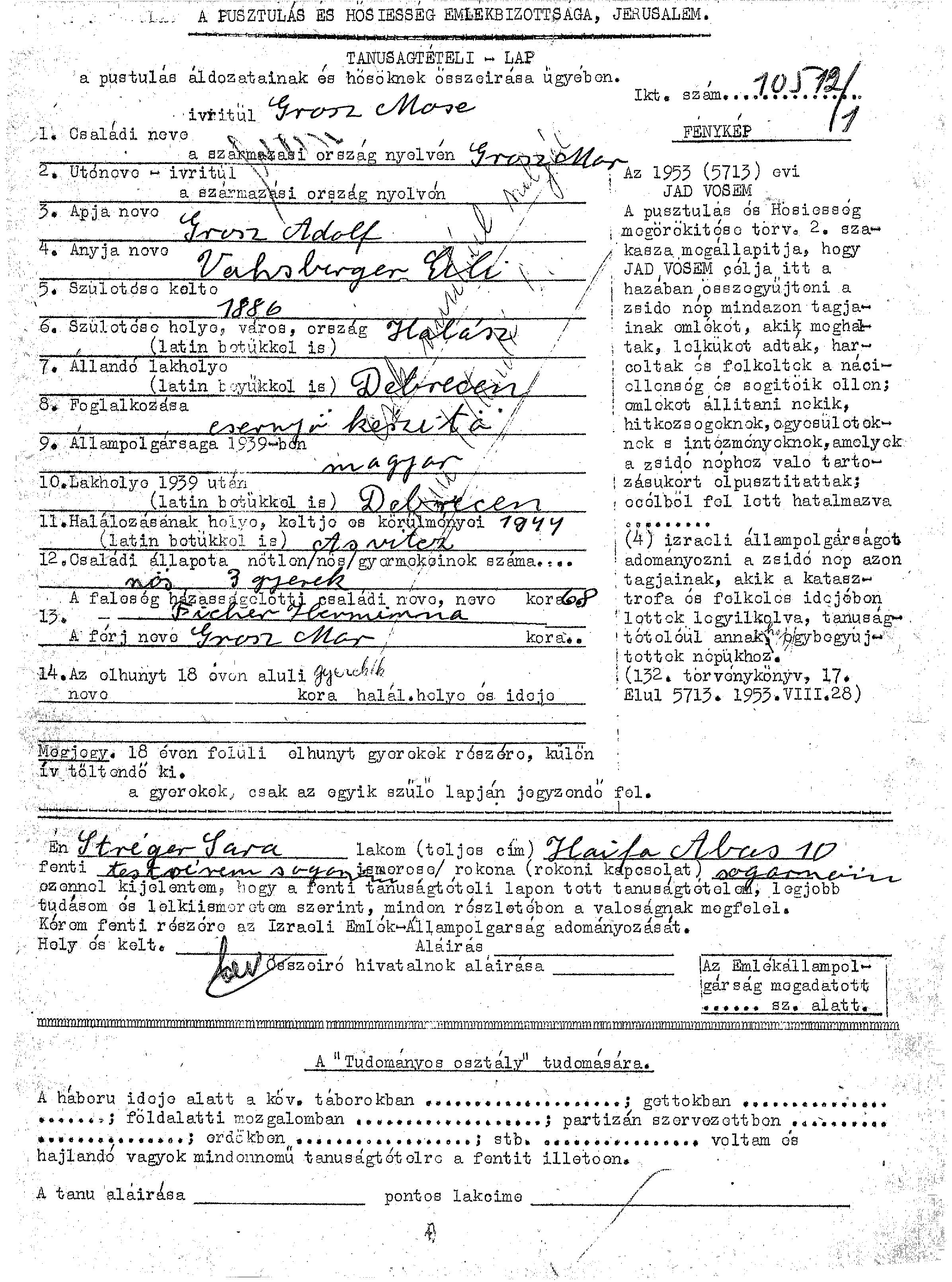 Mor Mose Grosz wurde im Jahr 1886 in Halasz, Ungarn geboren. Er war der Sohn von Adolf und Cili. Er war Esernyo keszito (מכין מטריות) und mit Herminna, geb. Ficher Verheiratet. Vor dem Zweiten Weltkrieg lebte er in Debrecen, Ungarn. Während des Krieges war er in Debrecen, Ungarn.