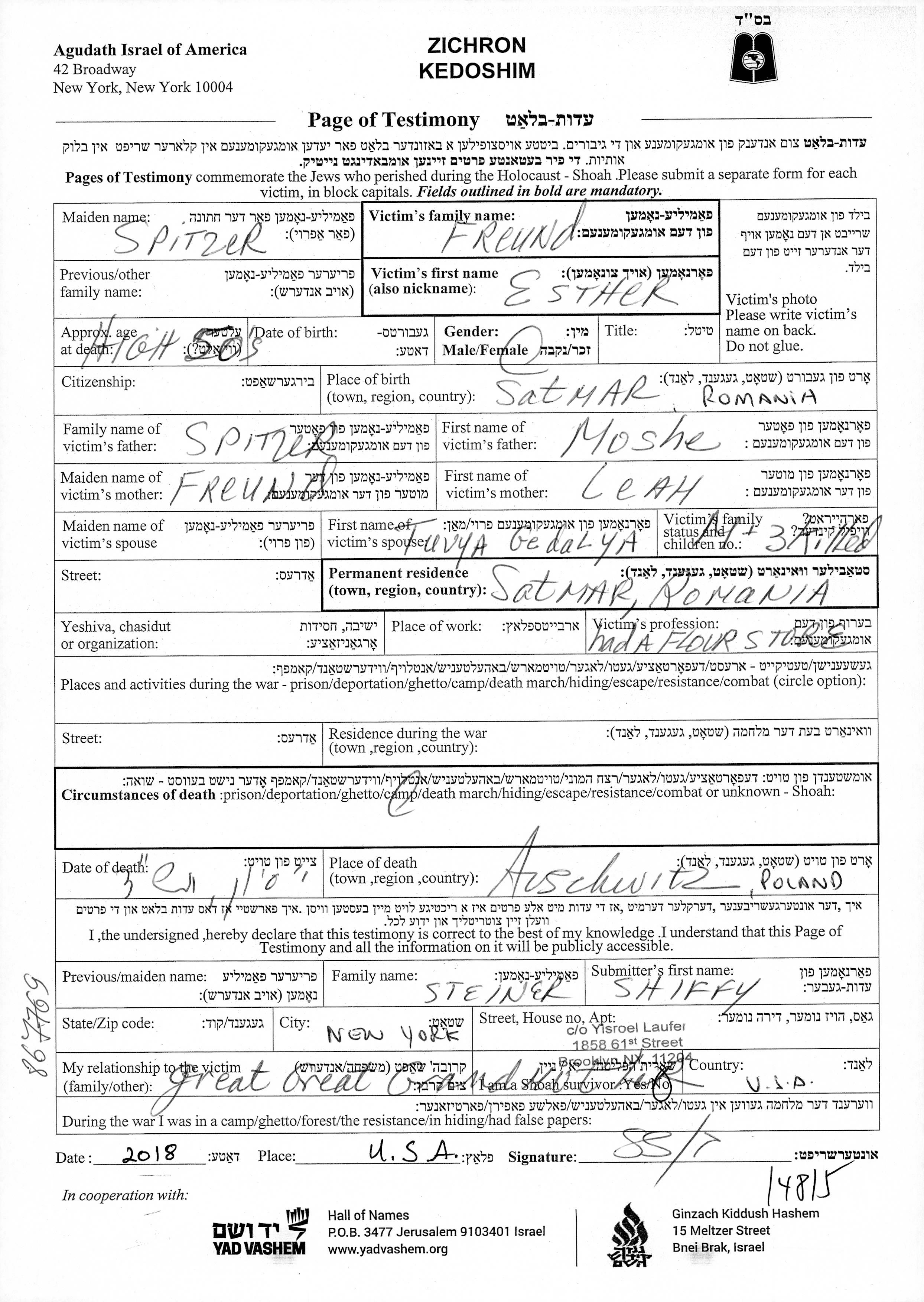 Freind Ester Satu Mare, Rumänien Aufzeichnungen ueber ermordete Personen