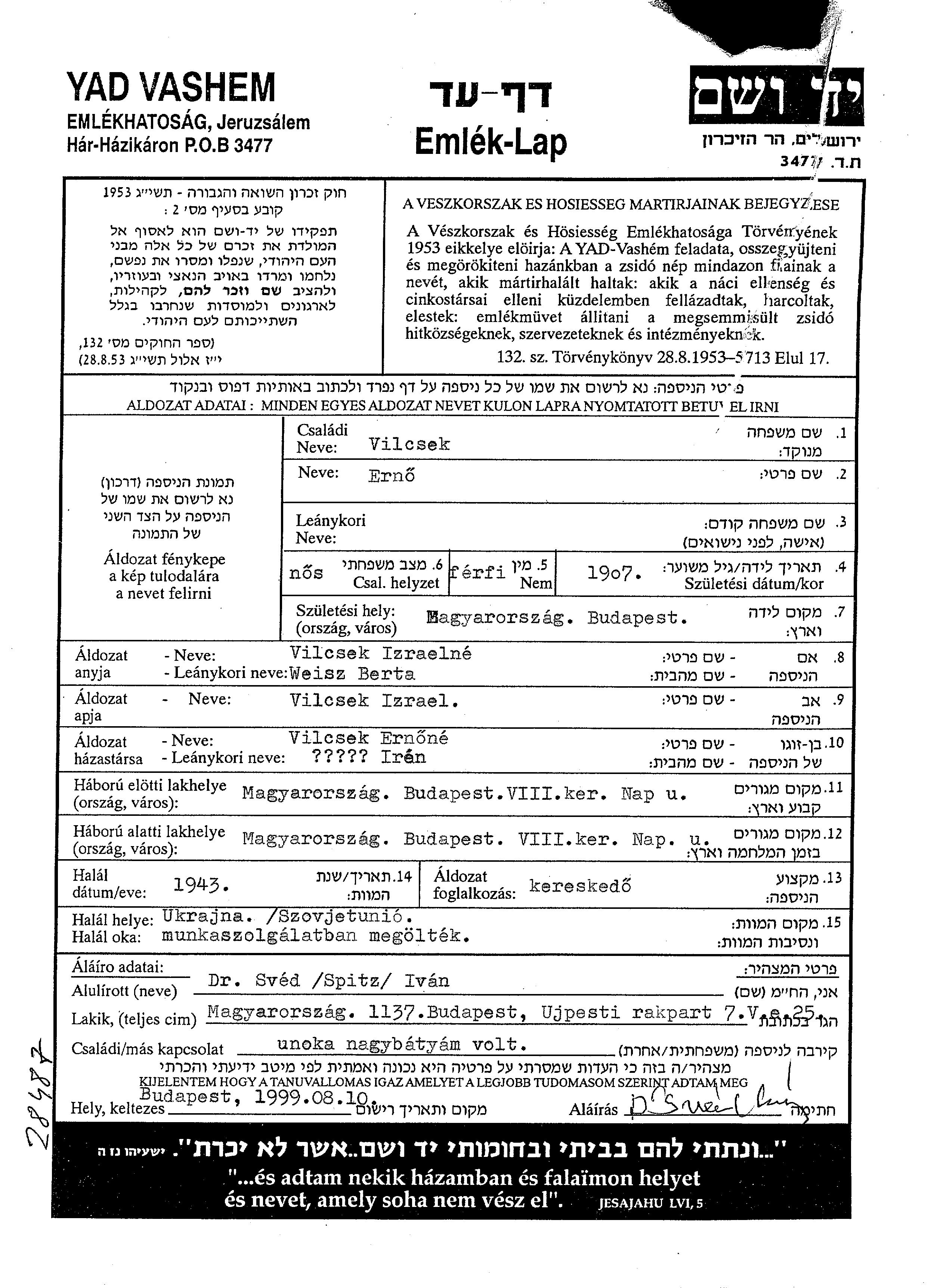 Vilchek Erno 1907 Budapest, Ungarn Gedenkblatt