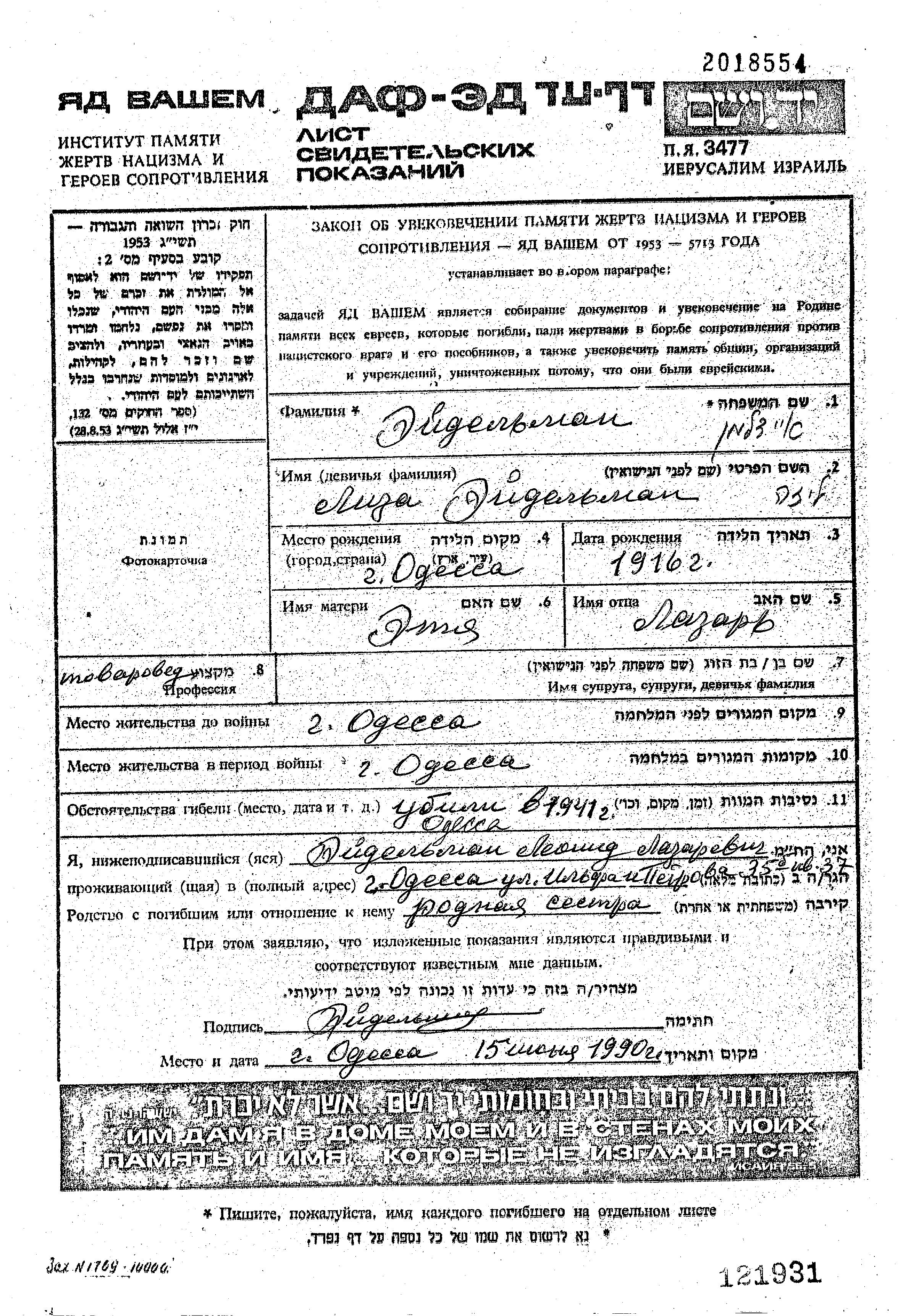 Liza Eidelman wurde im Jahr 1916 in Odessa, Ukraine (UdSSR) geboren. Vor dem Zweiten Weltkrieg lebte sie in Odessa, Ukraine (UdSSR).