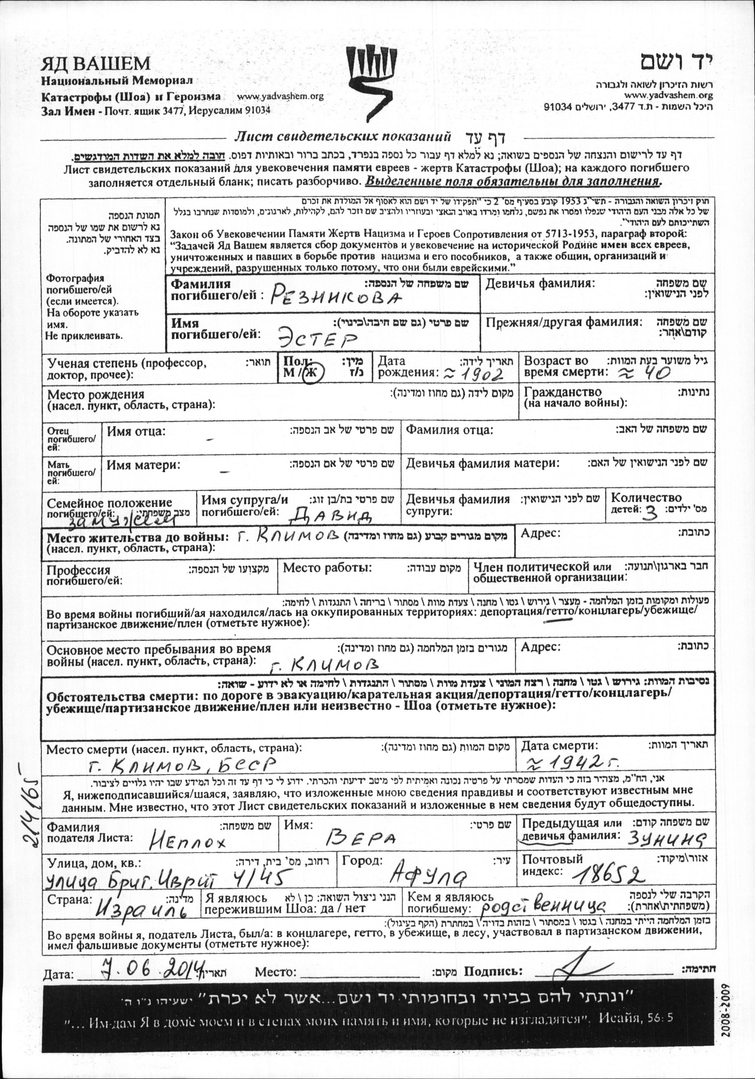 Ester wurde in der Schoah ermordet. Todesort: Klimov, Russland (UdSSR) im Jahr 1942.