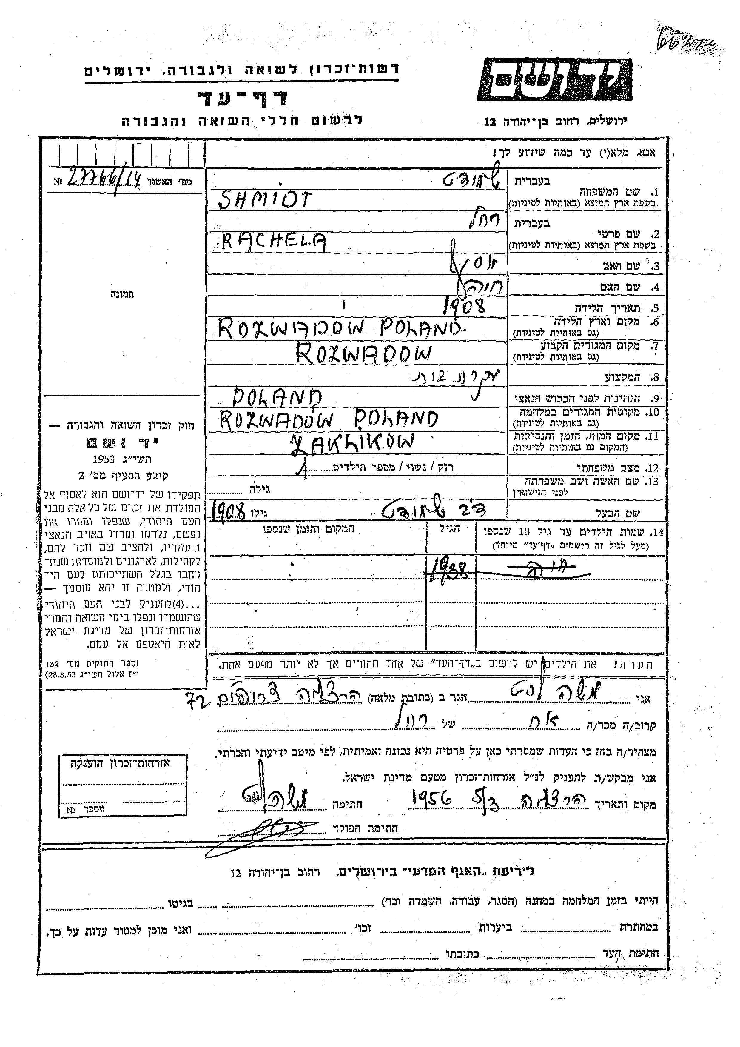 Shmidt Khaia 1938 Rozwadów, Polen Gedenkblatt