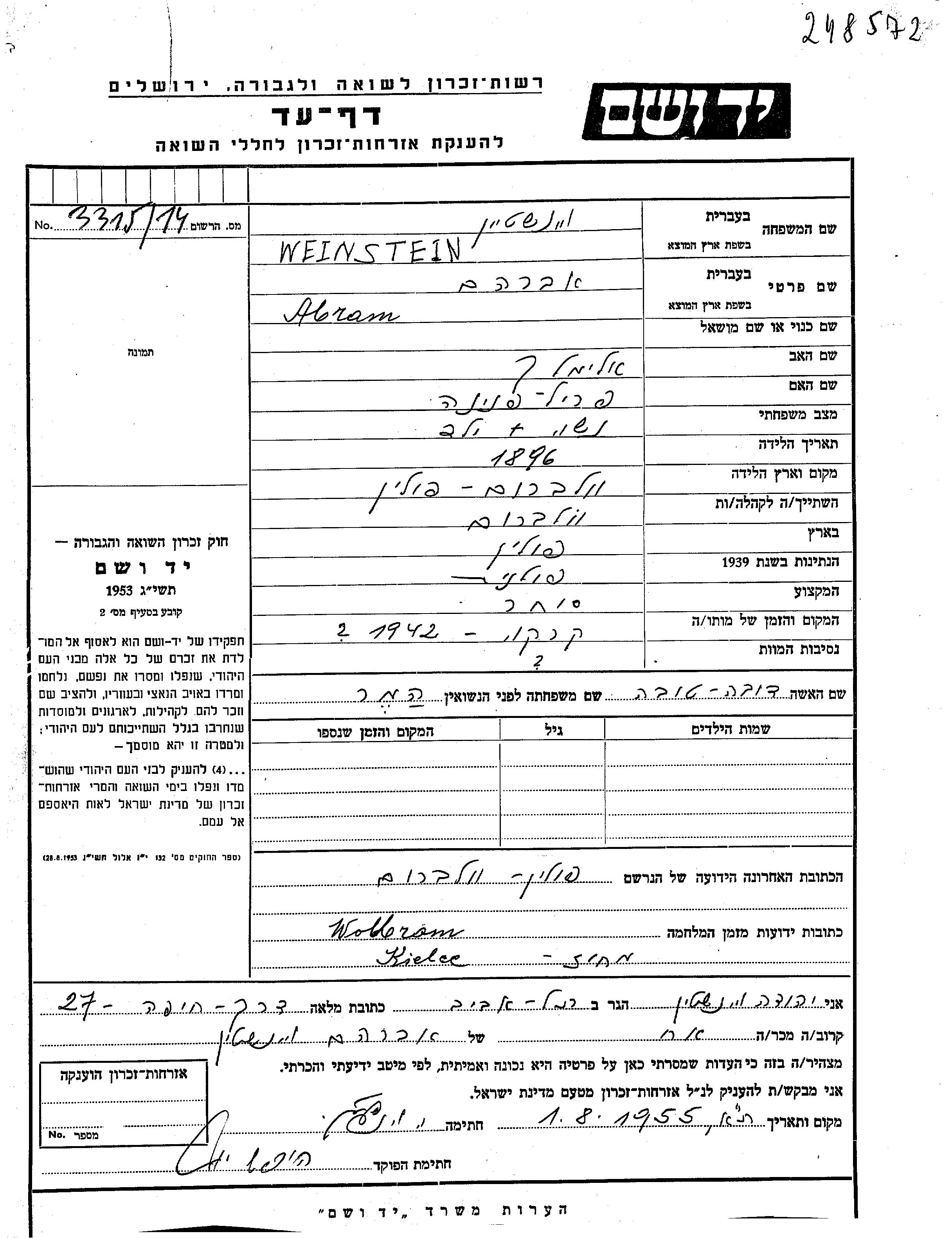 Avrum Weinstein wurde im Jahr 1896 in Wolbrom, Polen geboren. Er war Kaufmann/-frau. Vor dem Zweiten Weltkrieg lebte er in Wolbrom, Polen.