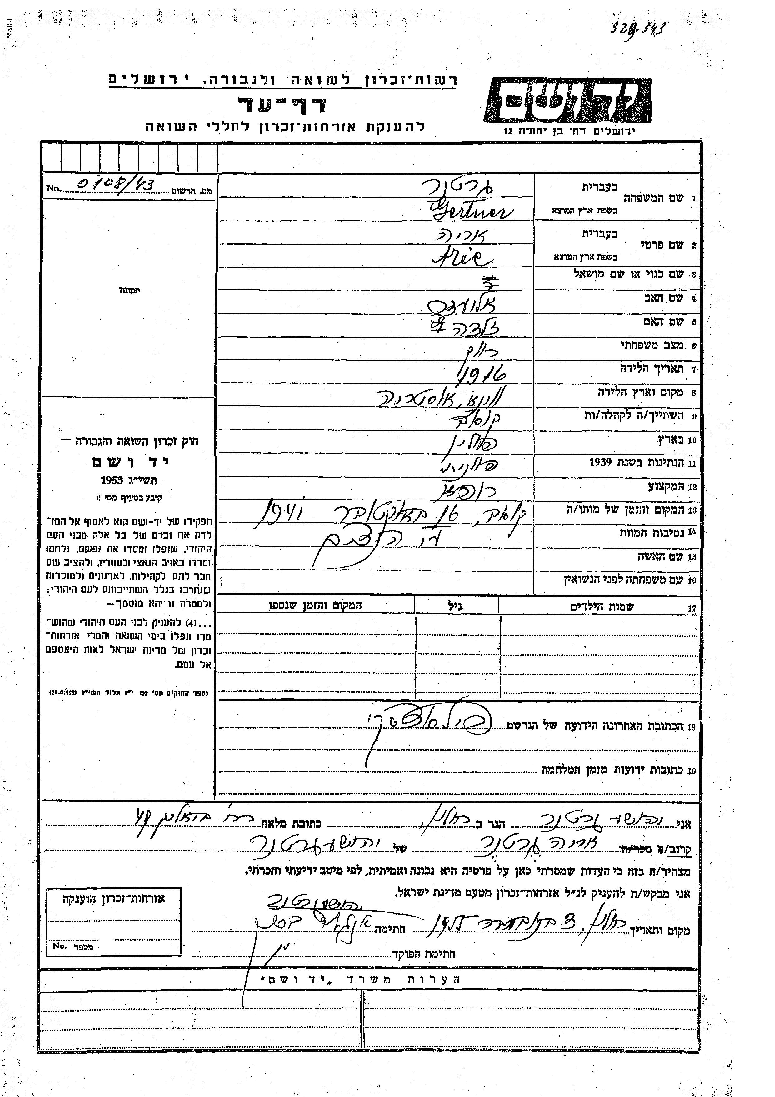 | Gertner | Arie | 1916 | Kosow, Polen | Gedenkblatt |