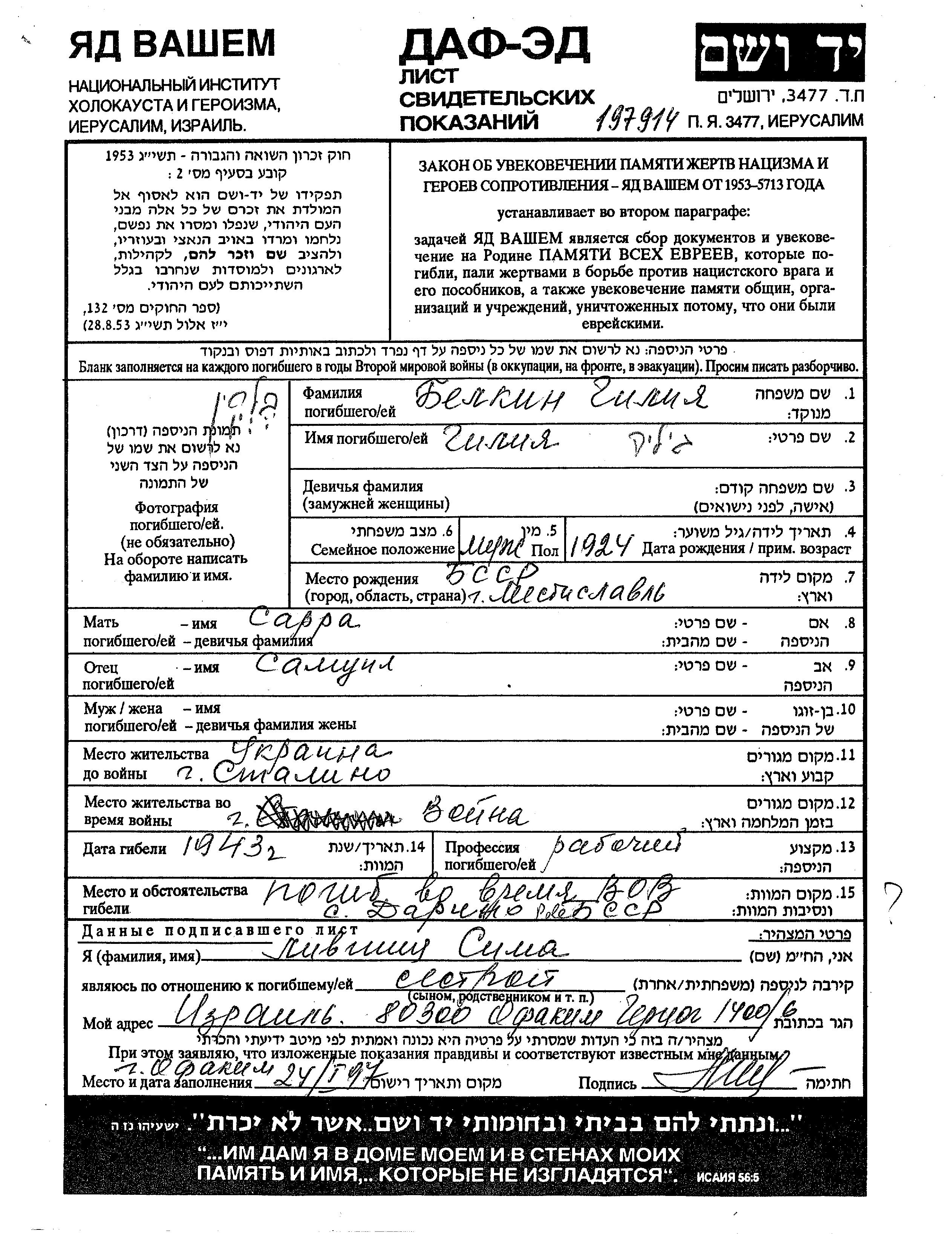 Gilya Belkin wurde im Jahr 1924 in Mstislavl, Weißrussland (UdSSR) geboren. Er war Arbeiter/-in. Vor dem Zweiten Weltkrieg lebte er in Stalino, Ukraine (UdSSR).