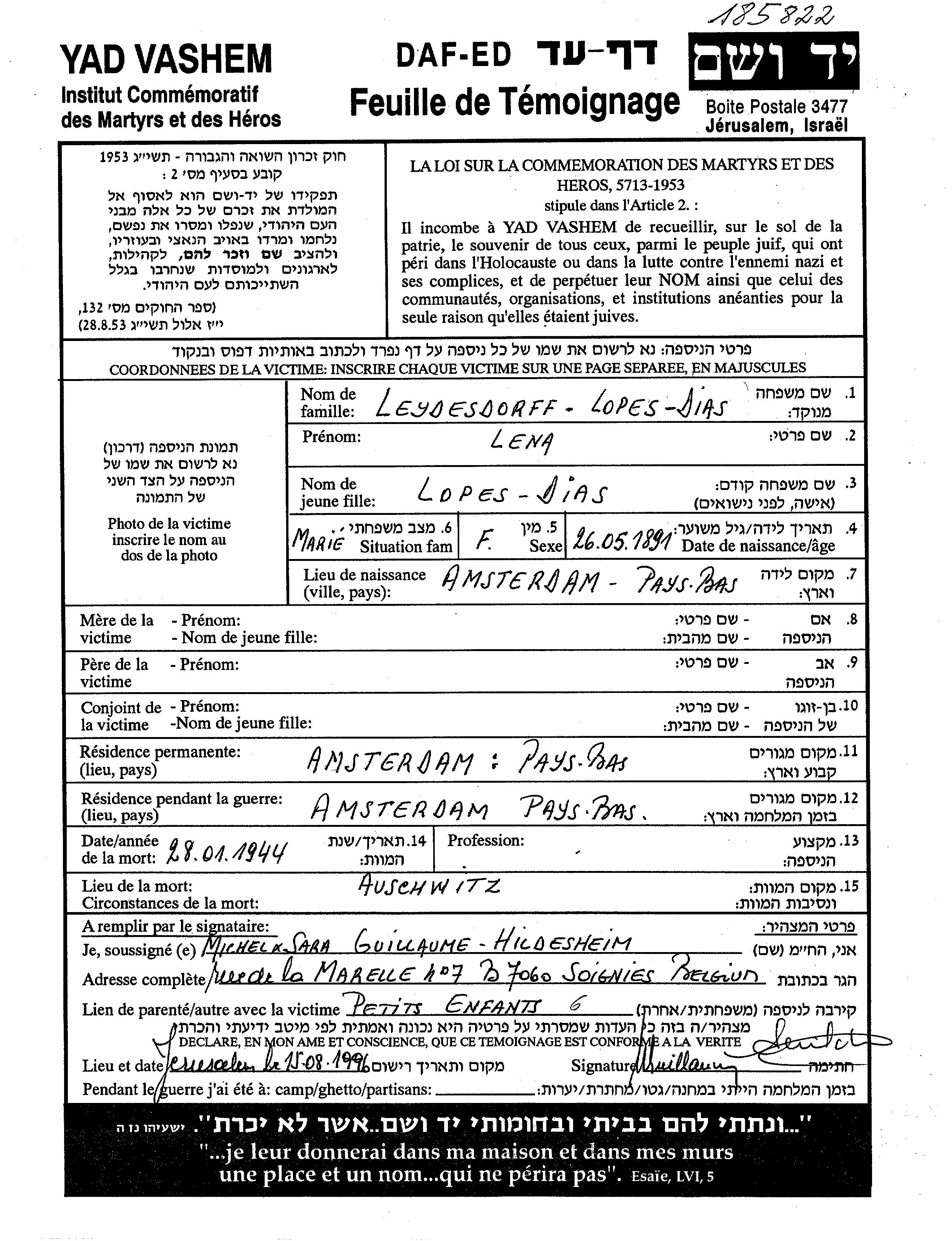 Lena Lijdesdorff Leydesdorff, geb. Lopes Dias wurde im Jahr 1891 in Amsterdam, Niederlande geboren. Vor dem Zweiten Weltkrieg lebte sie in Amsterdam, Niederlande.