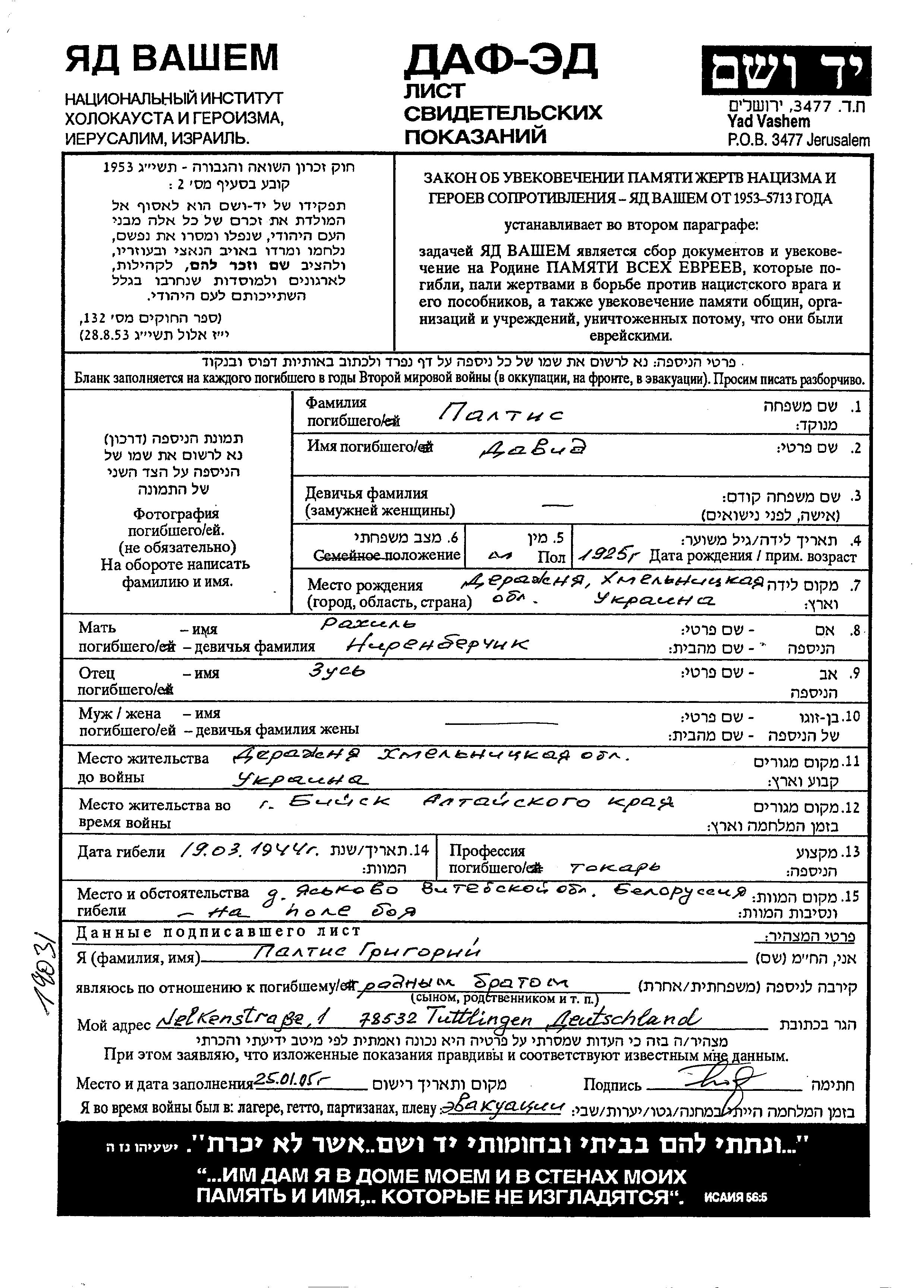 David Paltis wurde im Jahr 1925 in Derazhnya, Ukraine (UdSSR) geboren. Vor dem Zweiten Weltkrieg lebte er in Derazhnya, Ukraine (UdSSR).