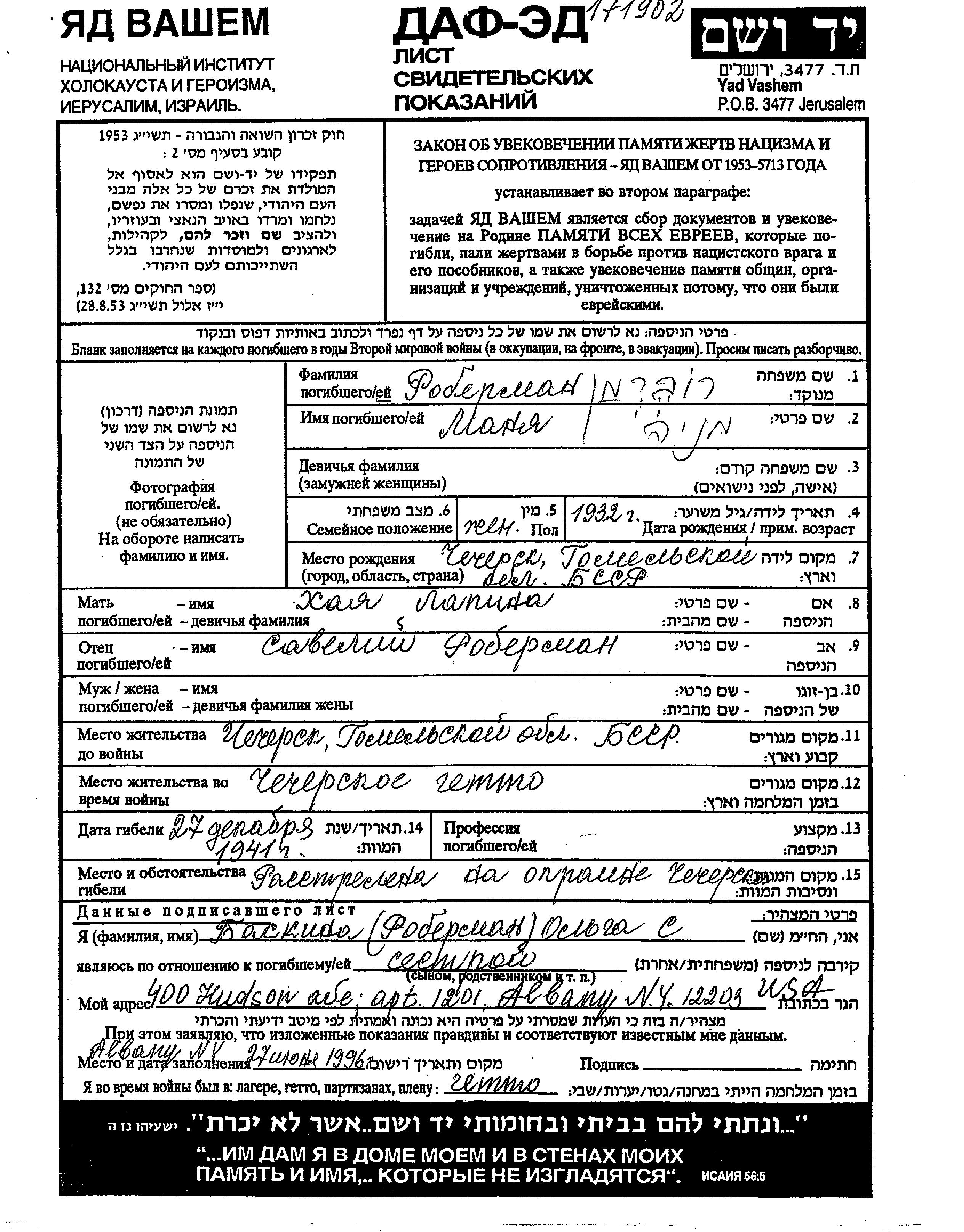 Manya wurde in der Schoah ermordet. Todesort: unbekannter Ort im Jahr 27/12/1941.