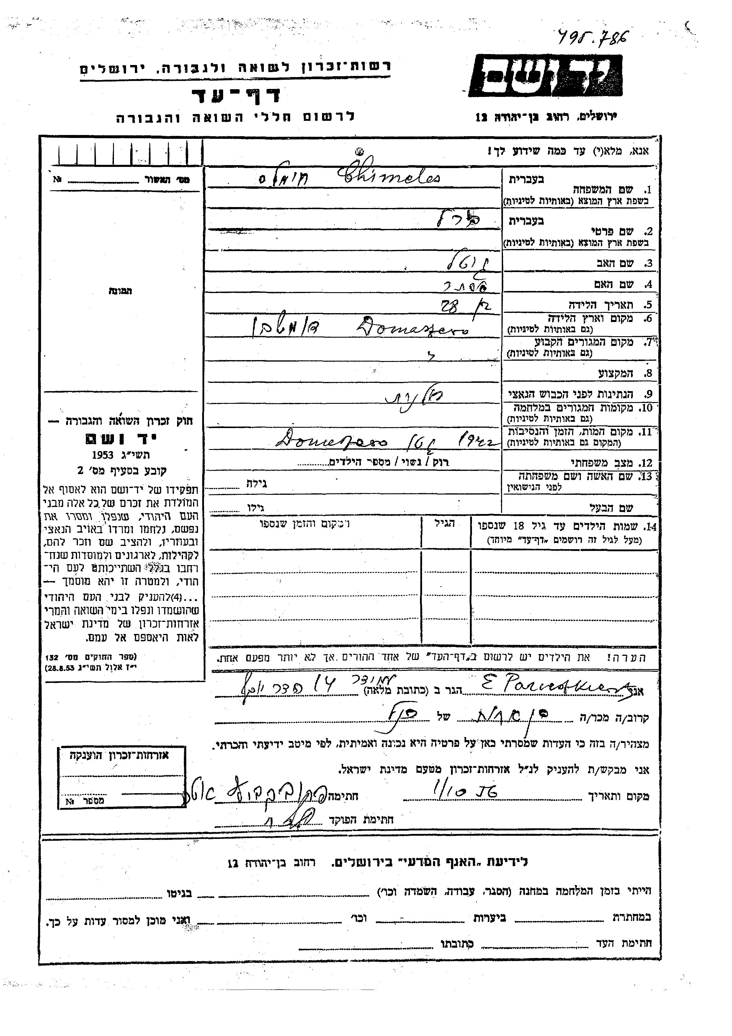 Berl Chimeles wurde in Domaczewo, Polen geboren. Er war Kaufmann/-frau. Vor dem Zweiten Weltkrieg lebte er in Domaczewo, Polen.