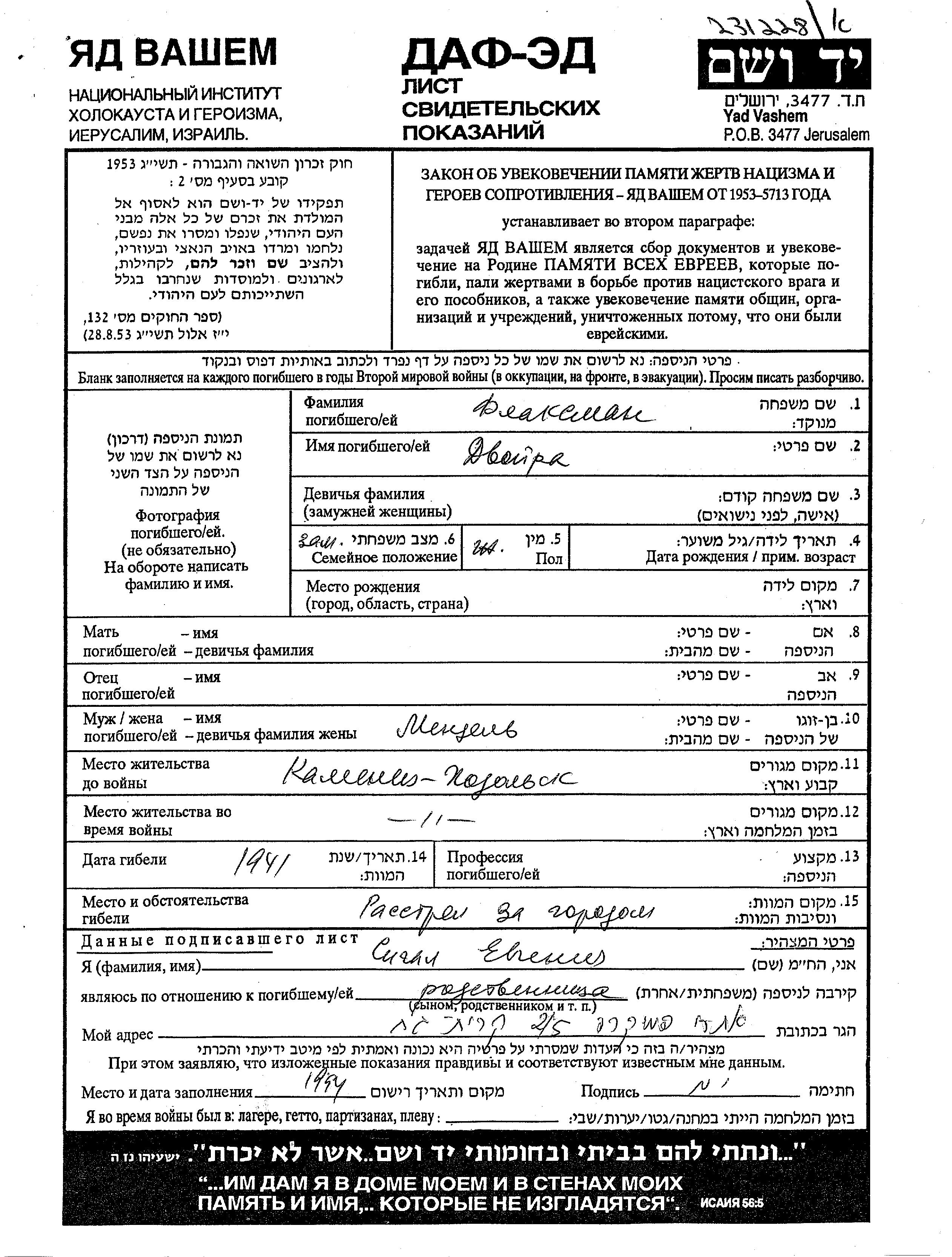 Dvoira wurde in der Schoah ermordet. Todesort: Kamenets Podolskiy, Ukraine (UdSSR) im Jahr 1941.
