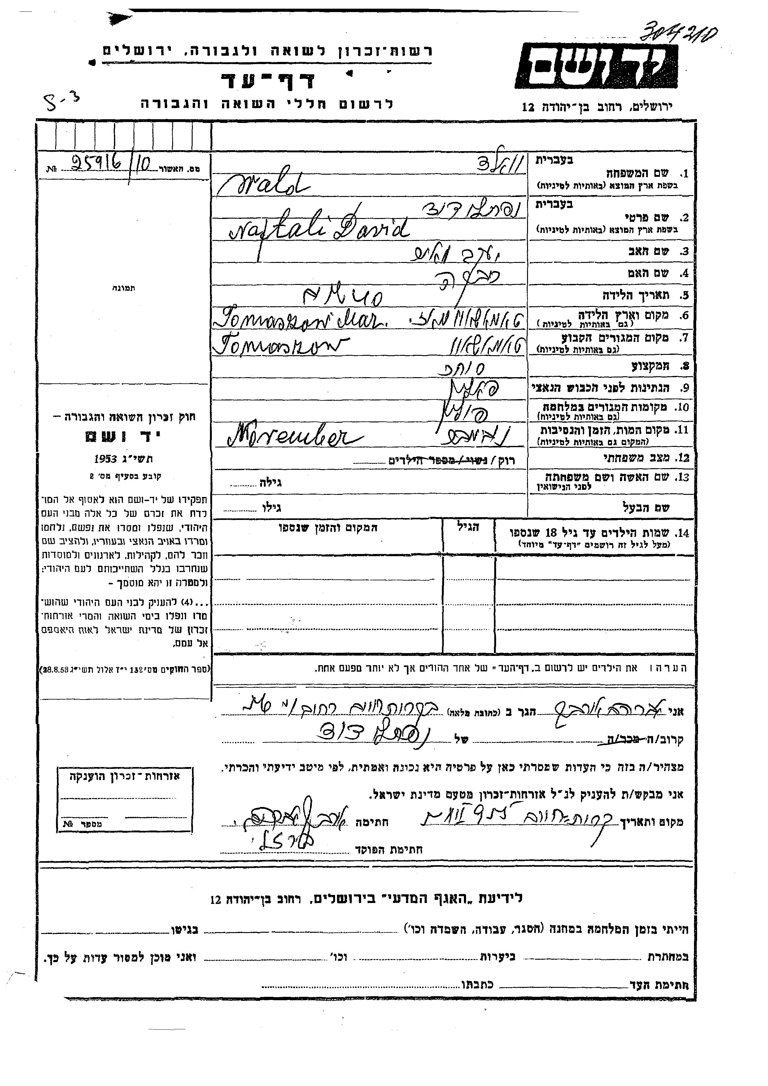 | Wald | Naftali David | Tomaszow Mazowiecki, Polen | Gedenkblatt | |