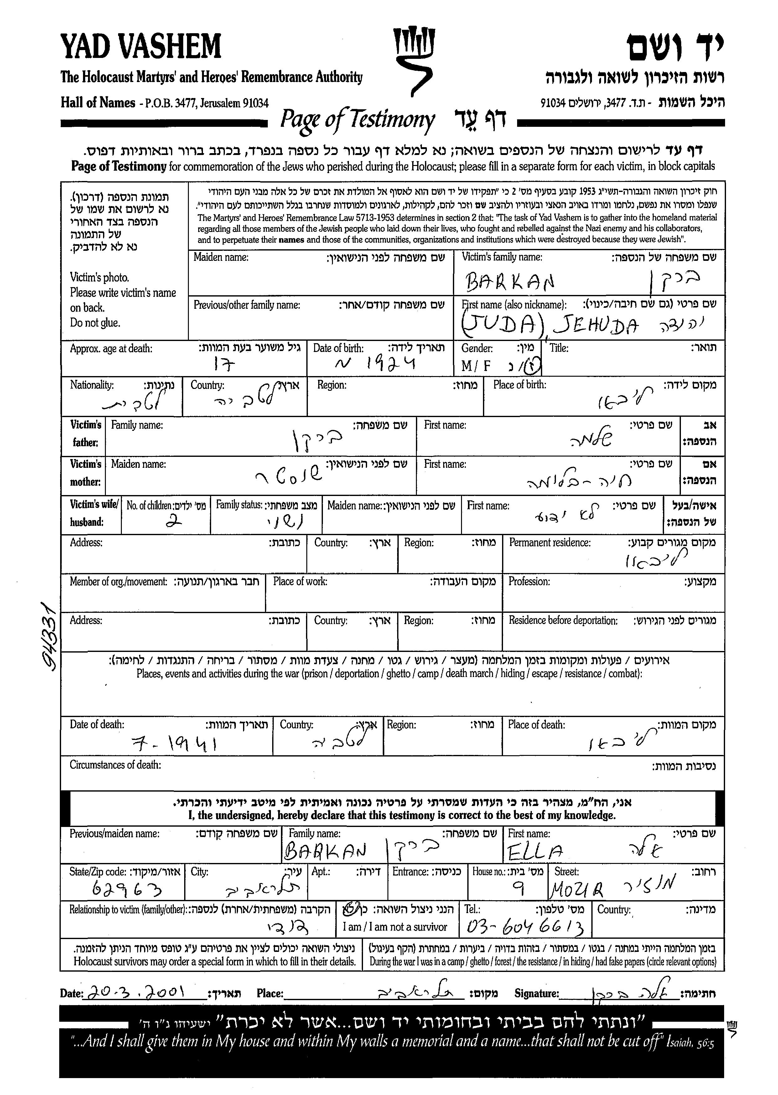Jehuda Barkan wurde im Jahr 1924 in Libau, Lettland geboren. Vor dem Zweiten Weltkrieg lebte er in Libau, Lettland.