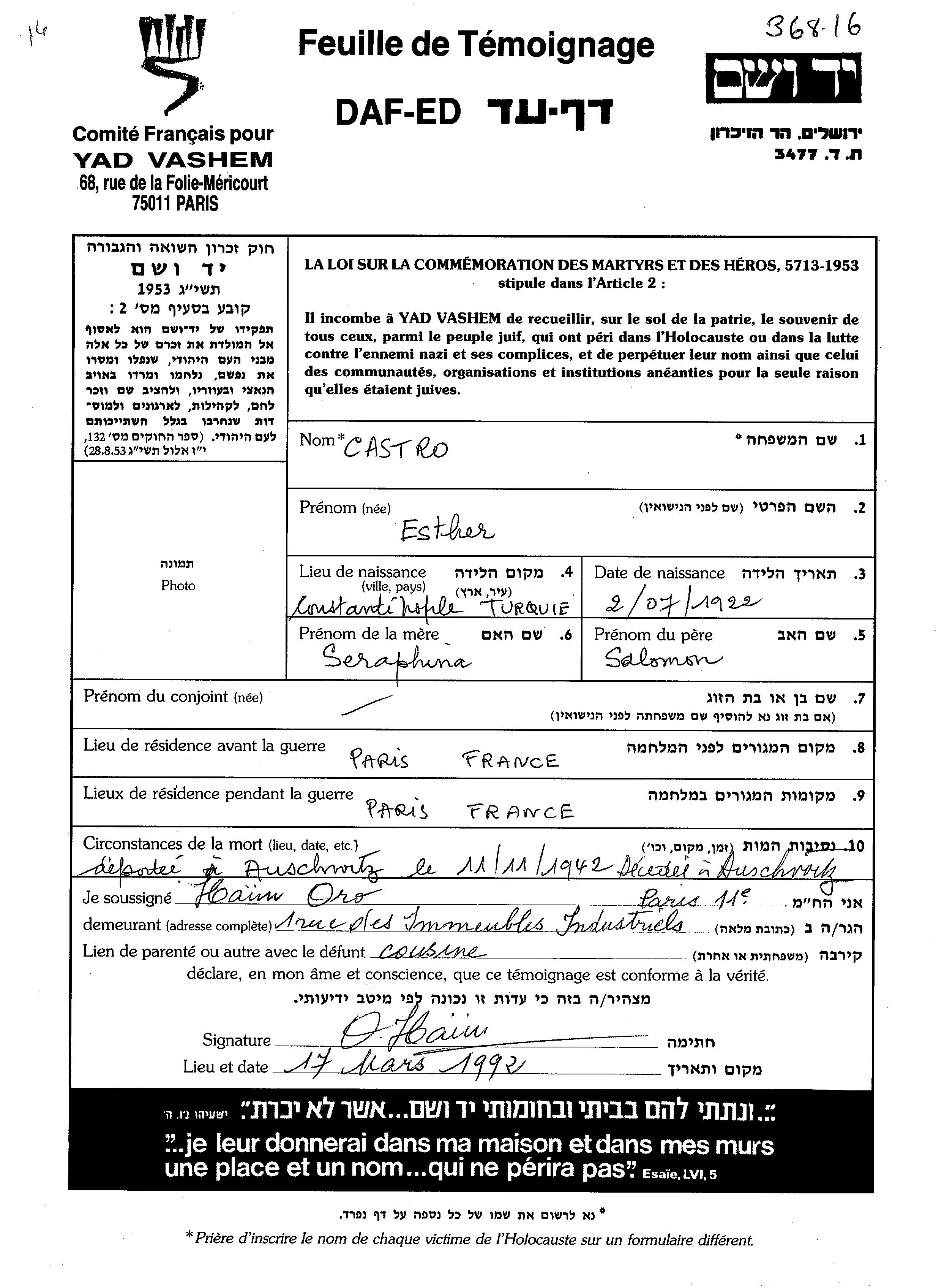 Castro Esther 1922 Constantinople, Türkei Liste von Deportierten aus Frankreich