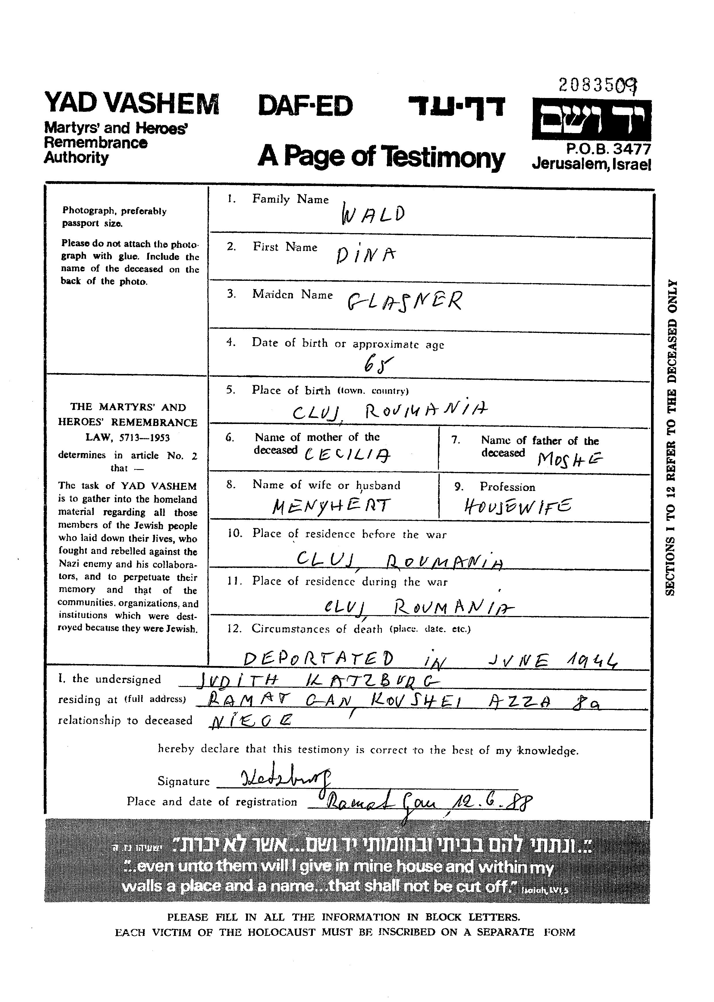 Dina Vald, geb. Glazner wurde im Jahr 1879 in Cluj, Rumänien geboren. Sie war Hausfrau. Vor dem Zweiten Weltkrieg lebte sie in Cluj, Rumänien.
