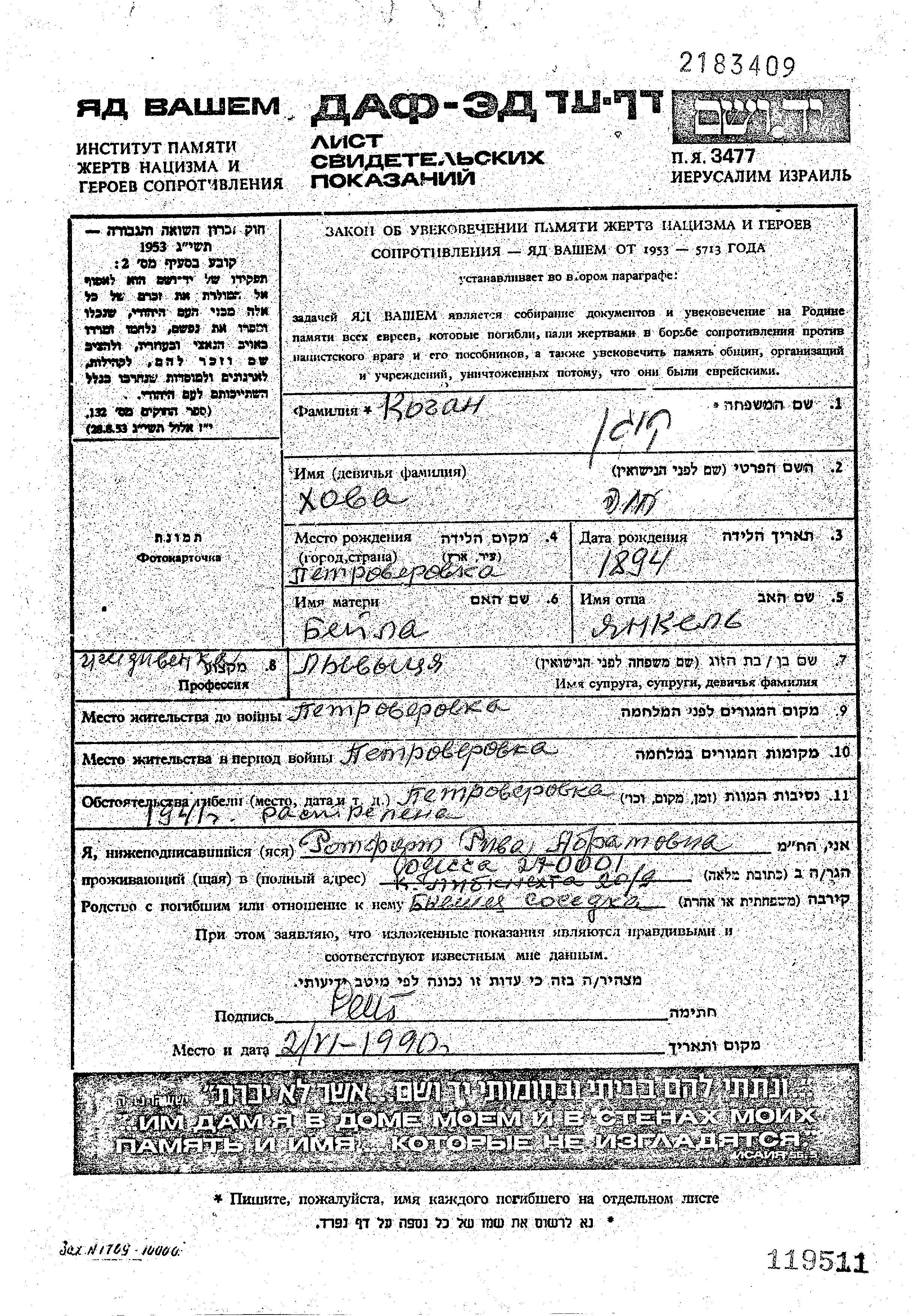 Khova Kogan wurde im Jahr 1894 in Petroverovka, Ukraine (UdSSR) geboren. Sie war Hausfrau. Vor dem Zweiten Weltkrieg lebte sie in Petroverovka, Ukraine (UdSSR).