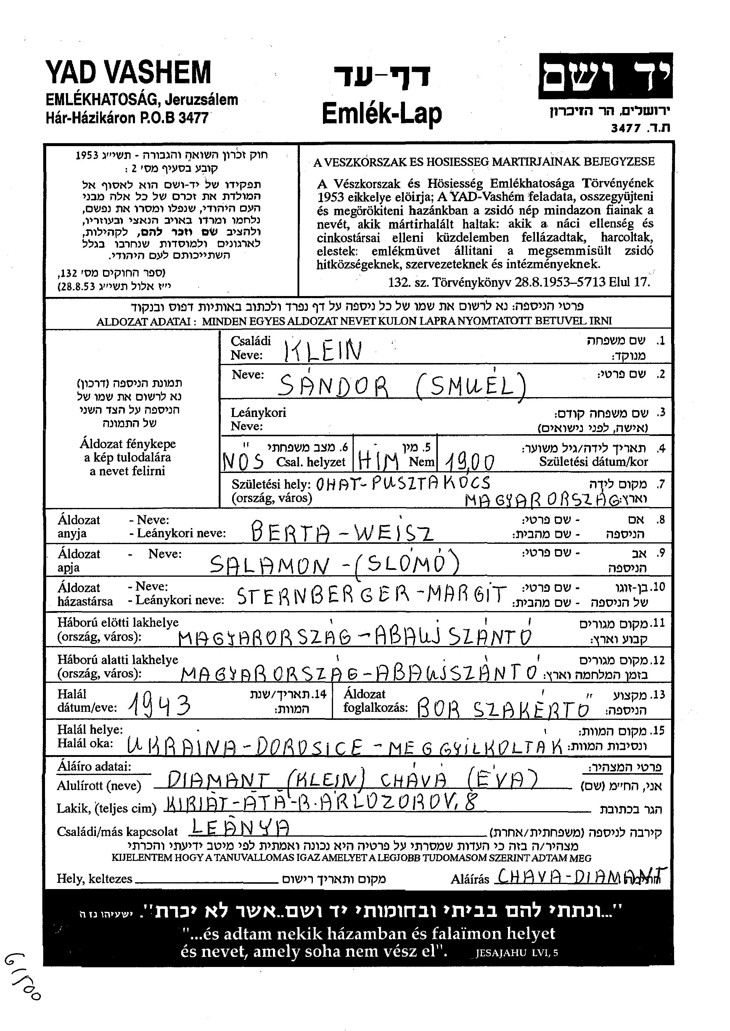 Sándor Smuel Klein wurde im Jahr 1900 in Pusztakocs, Ungarn geboren. Vor dem Zweiten Weltkrieg lebte er in Abaujszanto, Ungarn.