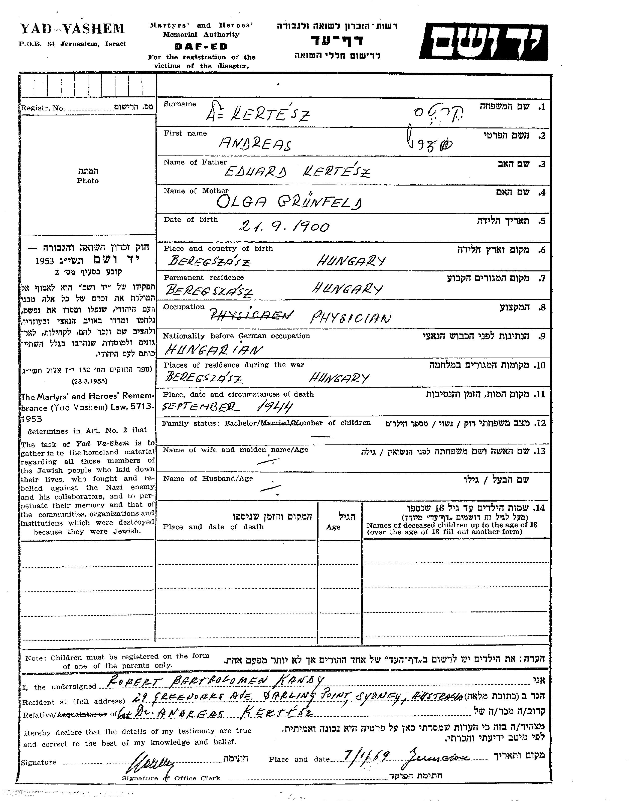 Kertesz Endre 1900 Beregszasz, Tschechoslowakei Verfolgtenliste