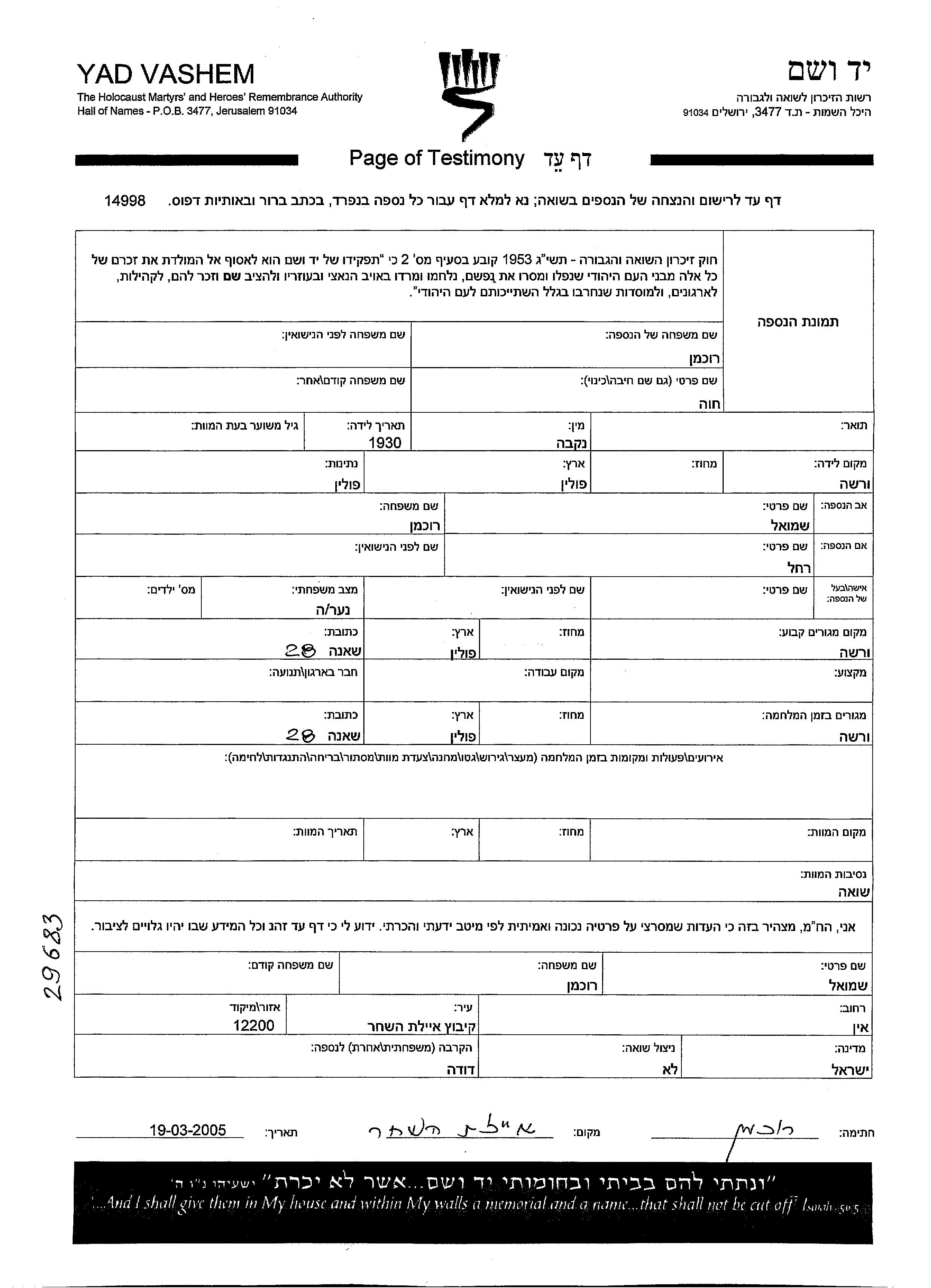 | Rukhman | Khava | 1930 | Warszawa, Polen | Gedenkblatt (digital, unterzeichnet) |