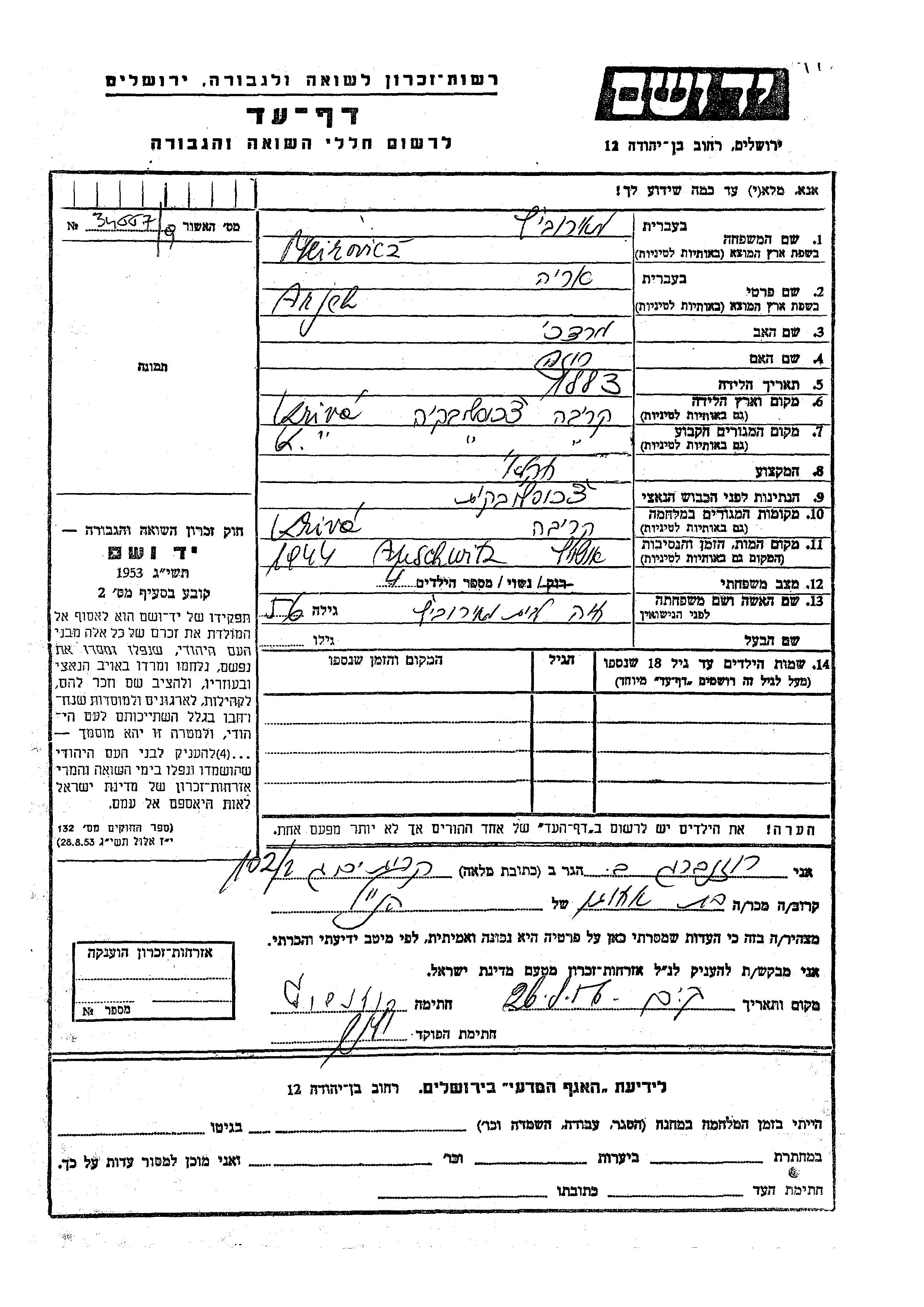 Arjeh Meirovicz wurde im Jahr 1883 in Kriva, Tschechoslowakei geboren. Er war der Sohn von Mordekhai und Roza. Er war Landwirt und mit Khaia, geb. Meirovitz Verheiratet. Vor dem Zweiten Weltkrieg lebte er in Kriva, Tschechoslowakei. Während des Krieges war er in Kriva, Tschechoslowakei.