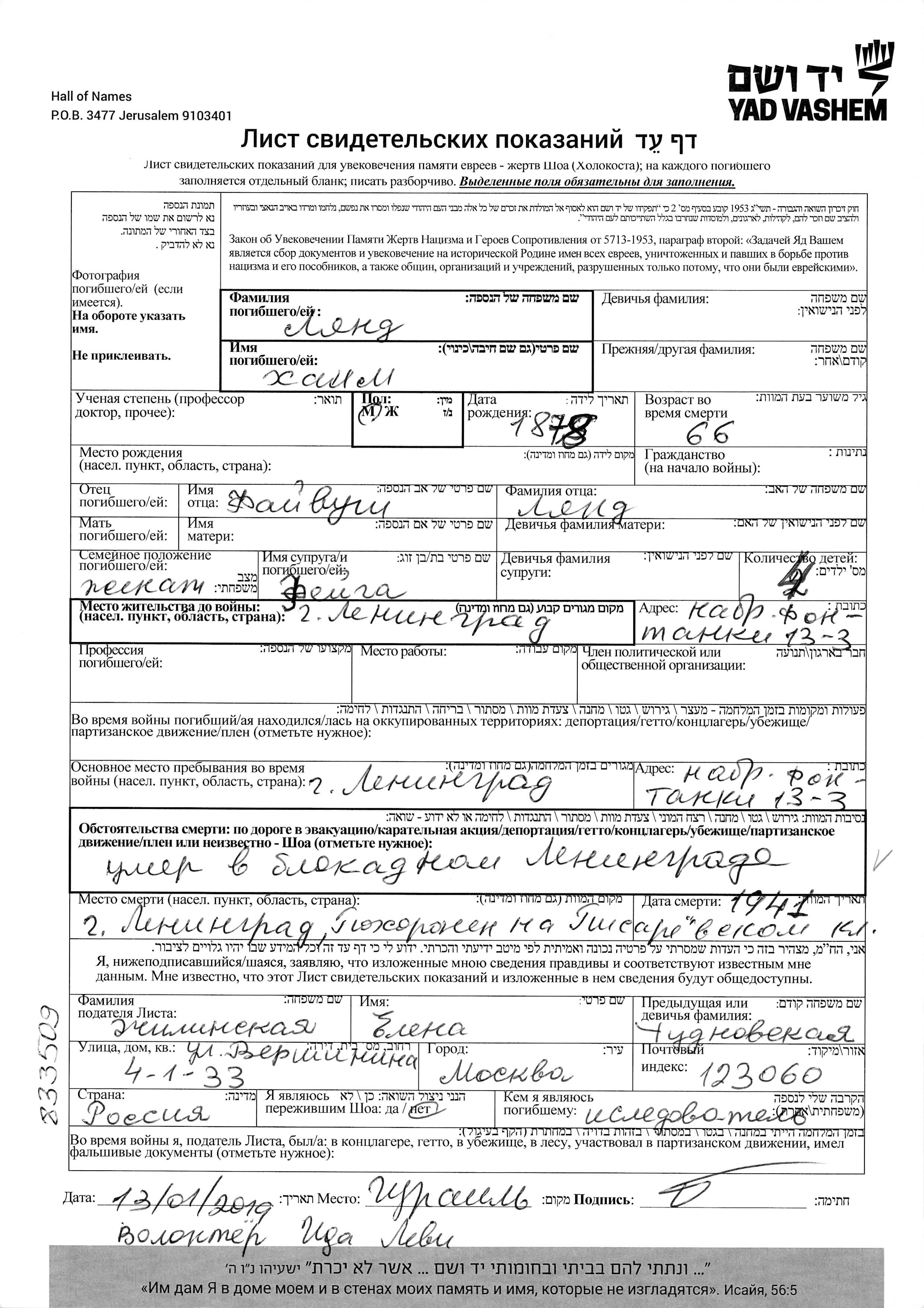Khaim wurde in der Zeit zwischen 1933-1945 in indirekter Beziehung mit der Shoah umgekommen. Todesort: Leningrad, Russland (UdSSR) im Jahr 1941.
