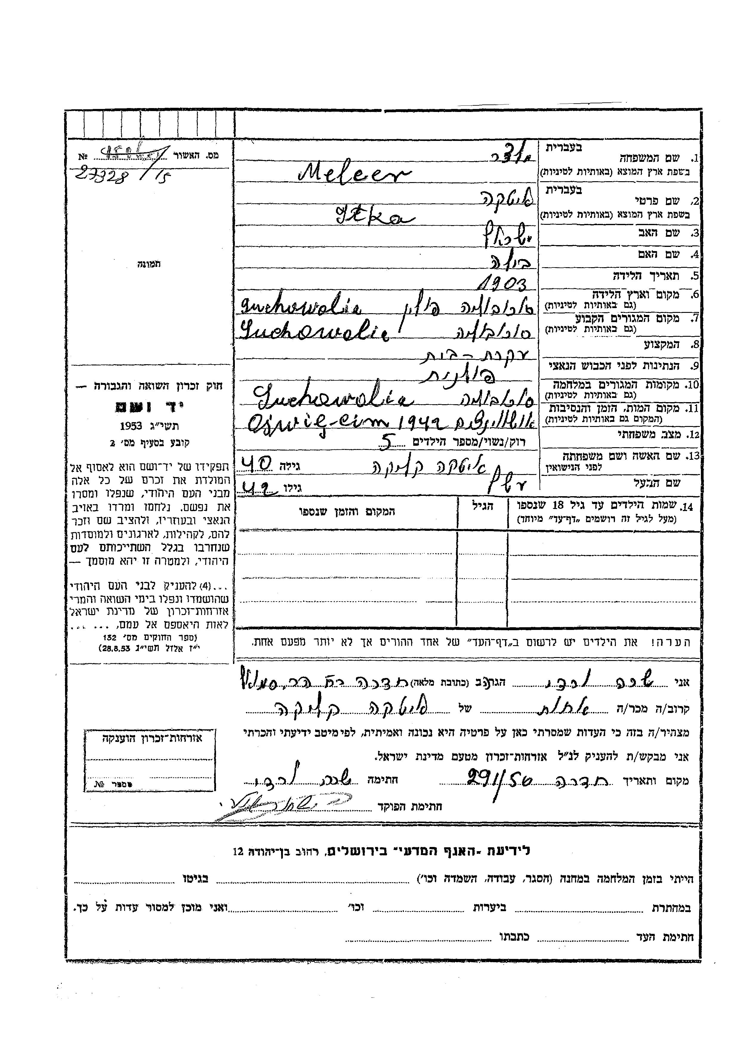 Itka Melcer, geb. Kalika wurde im Jahr 1903 in Suchowola, Polen geboren. Sie war die Tochter von Yisrael und Bila. Sie war Hausfrau und mit Yehoshua Verheiratet. Vor dem Zweiten Weltkrieg lebte sie in Suchowola, Polen. Während des Krieges war sie in Suchowola, Polen.