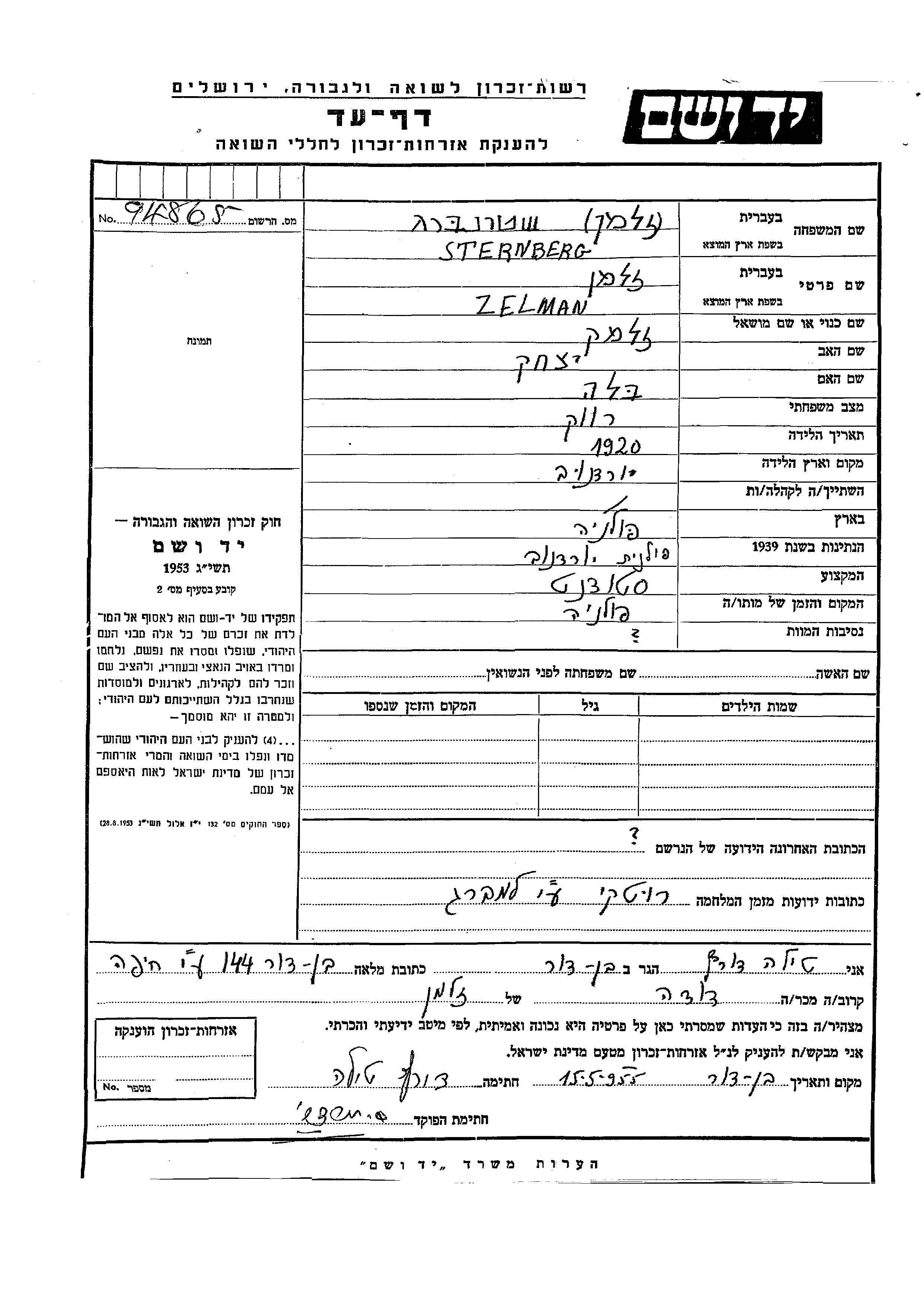 Zelman Sternberg wurde im Jahr 1920 in Jordanow, Polen geboren. Er war Student. Vor dem Zweiten Weltkrieg lebte er in Jordanow, Polen.