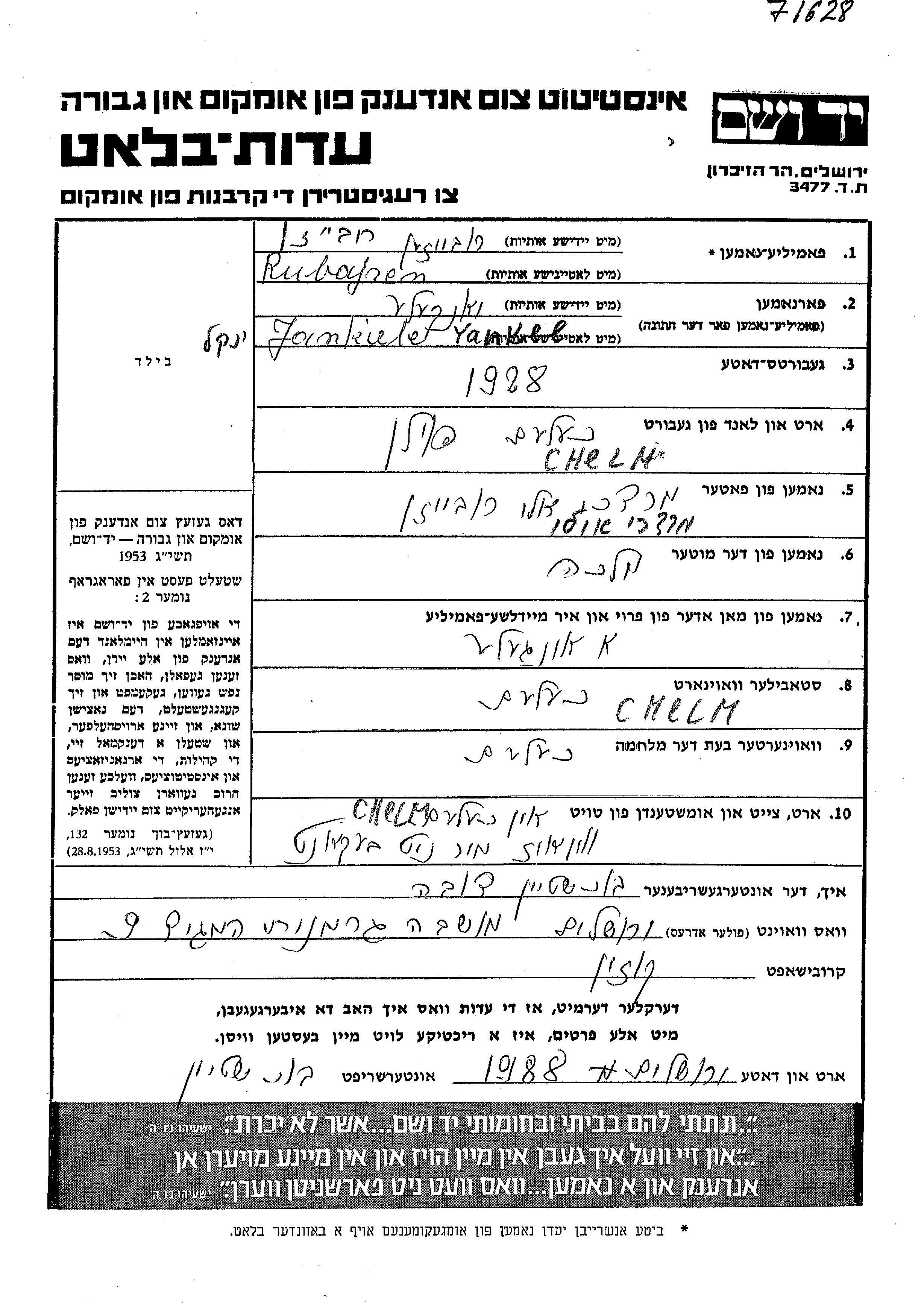 Yaakov wurde in der Schoah ermordet. Todesort: Chelm, Polen.