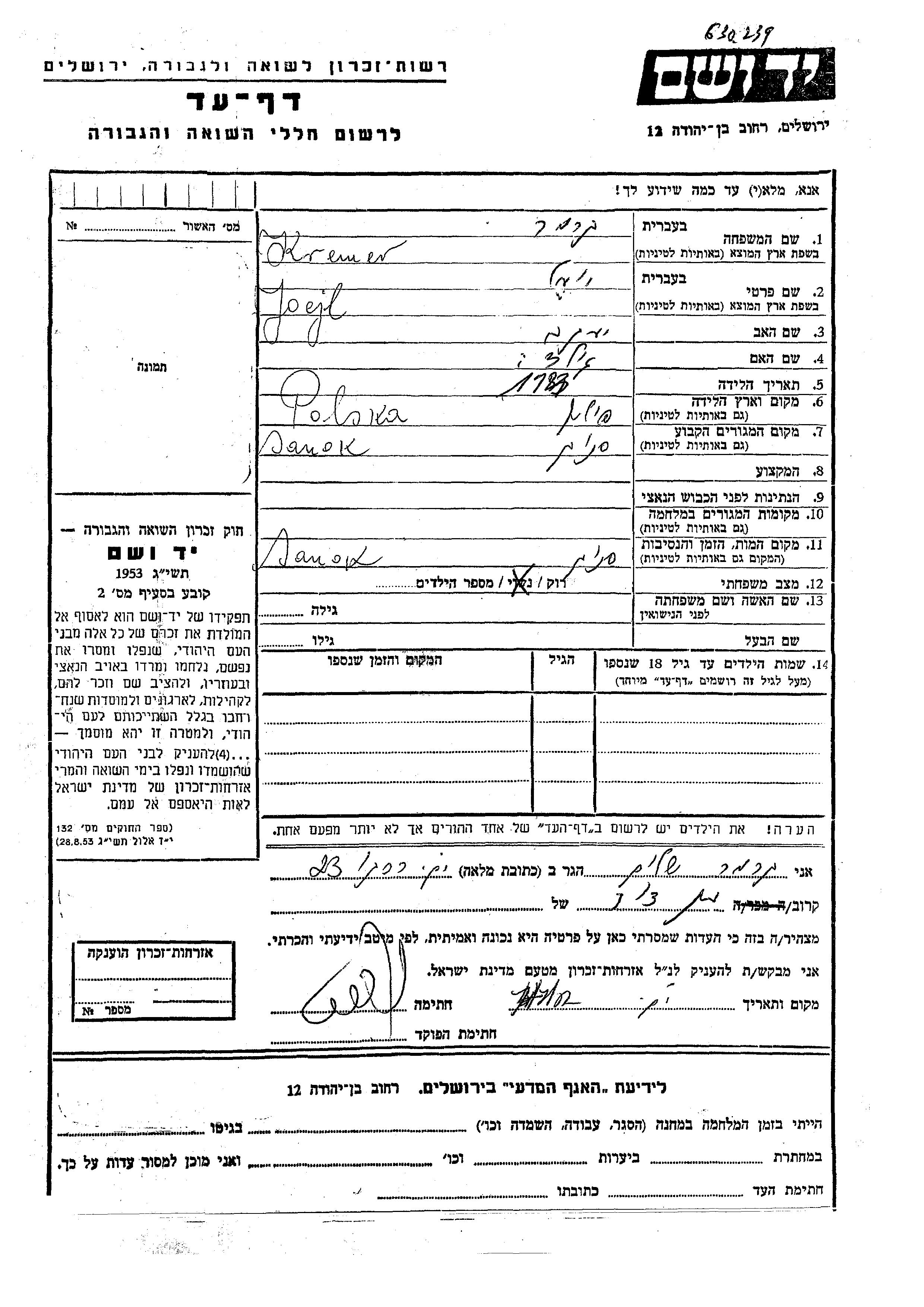 Yoel wurde in der Schoah ermordet. Todesort: Sanok, Polen.