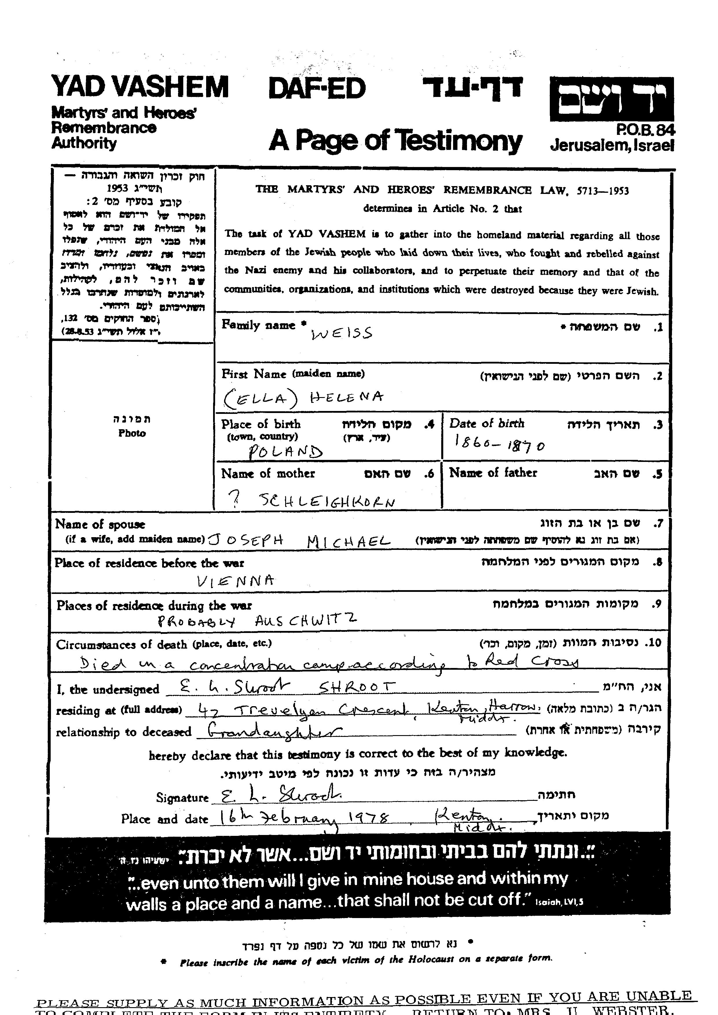 Helena Ella Weiss wurde im Jahr 1860 in Polen geboren. Sie war mit Joseph Michael Verheiratet. Vor dem Zweiten Weltkrieg lebte sie in Vienna, Österreich. Während des Krieges war sie in Auschwitz, Polen.