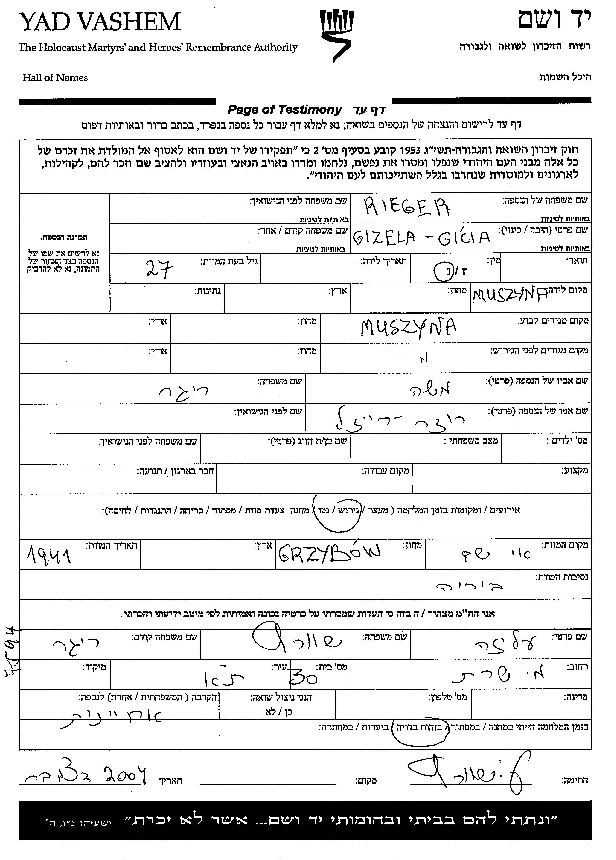 Gizela Gytl Ryger wurde im Jahr 1914 in Muszyna, Polen geboren. Vor dem Zweiten Weltkrieg lebte sie in Muszyna, Polen.
