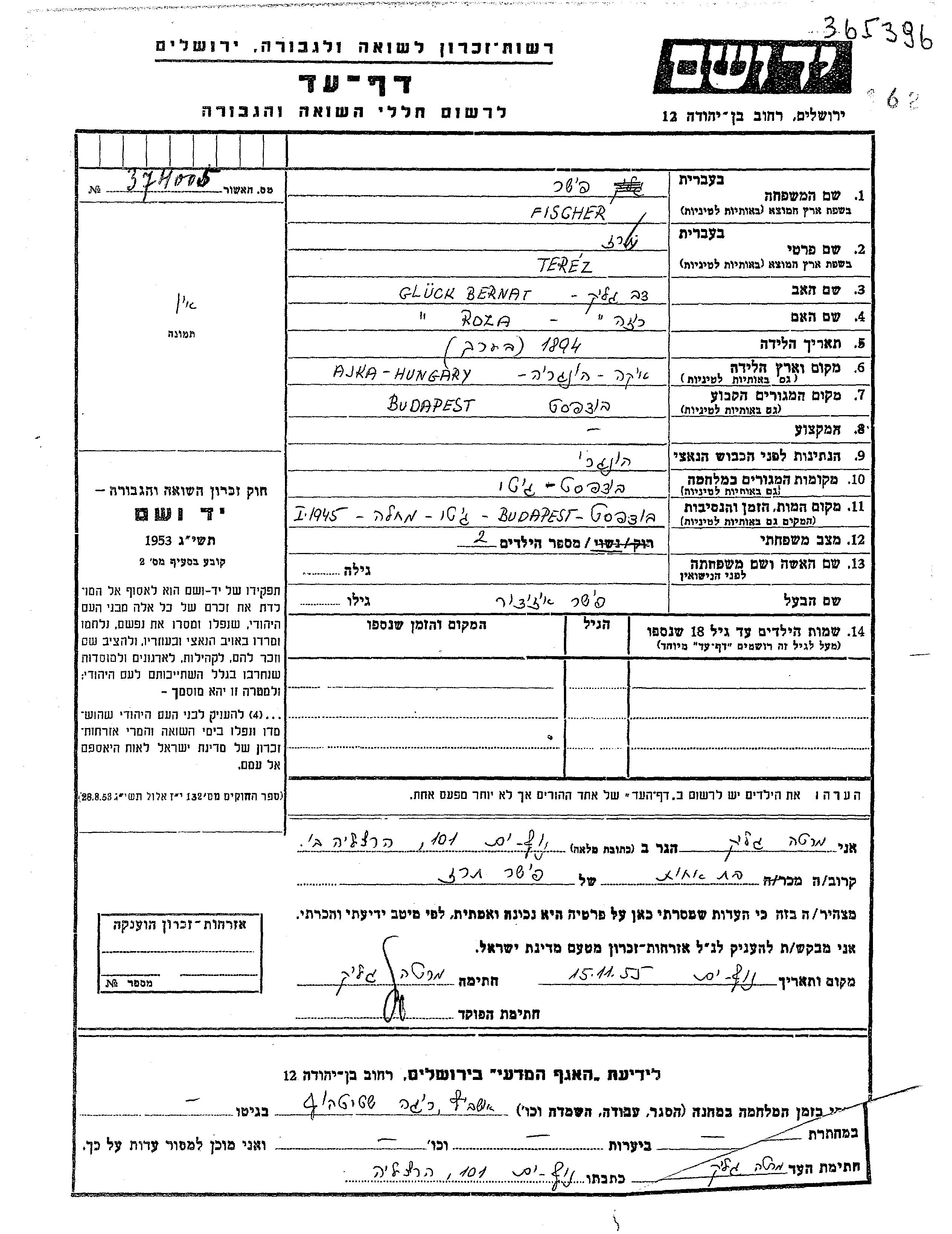 Teréz Fischer, geb. Gluck wurde im Jahr 1894 in Ajka, Ungarn geboren. Sie war Hausfrau. Vor dem Zweiten Weltkrieg lebte sie in Budapest, Ungarn.