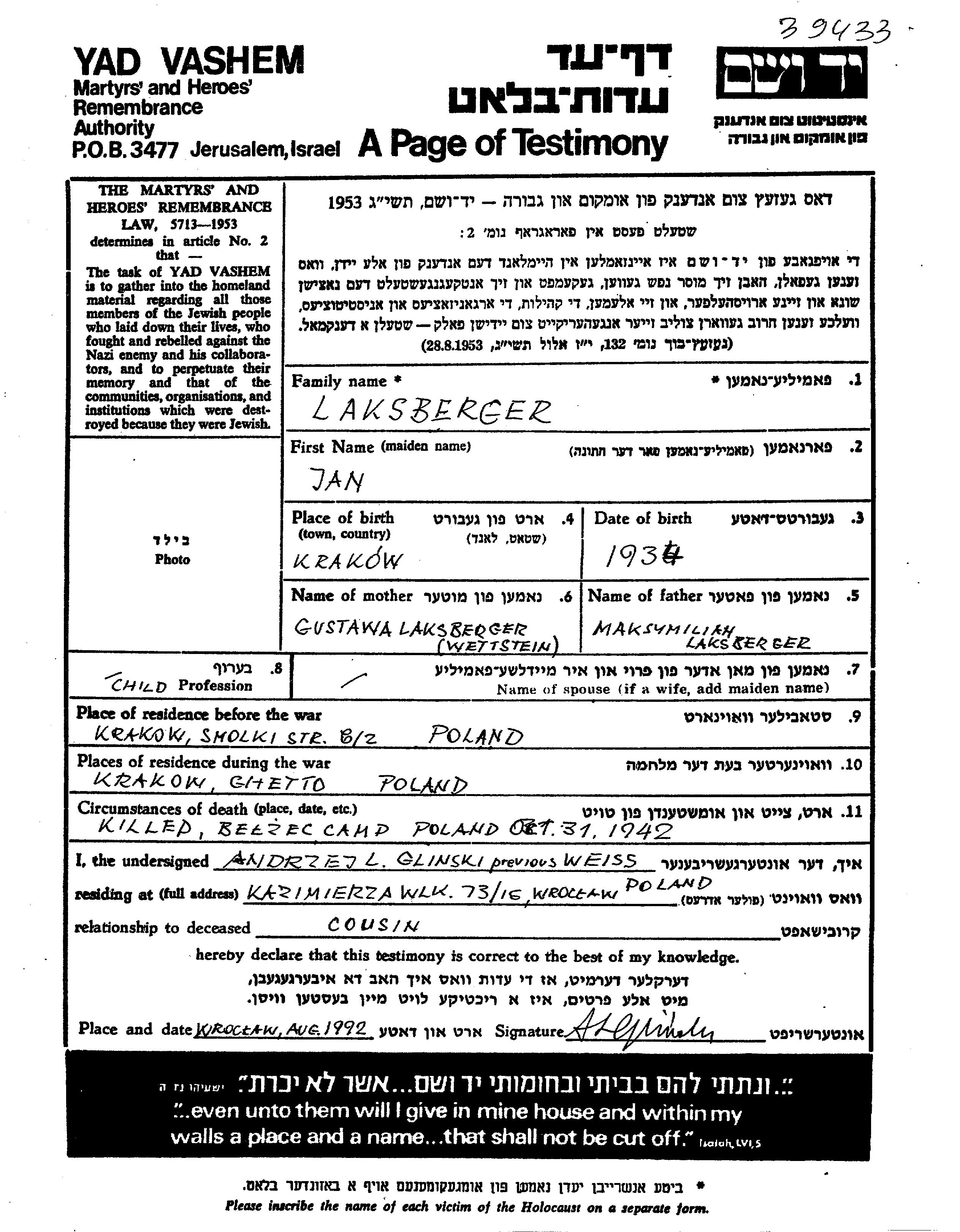 Yanek wurde in der Schoah ermordet. Todesort: Belzec, Polen im Jahr 31/10/1942.