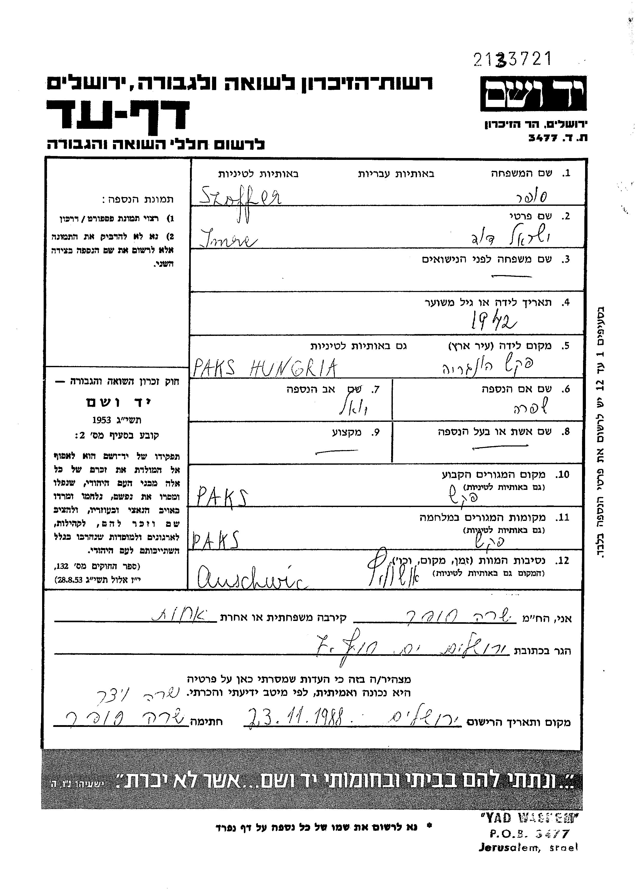 Israel David Imre Szoffer wurde im Jahr 1942 in Paks, Ungarn geboren. Vor dem Zweiten Weltkrieg lebte er in Paks, Ungarn.