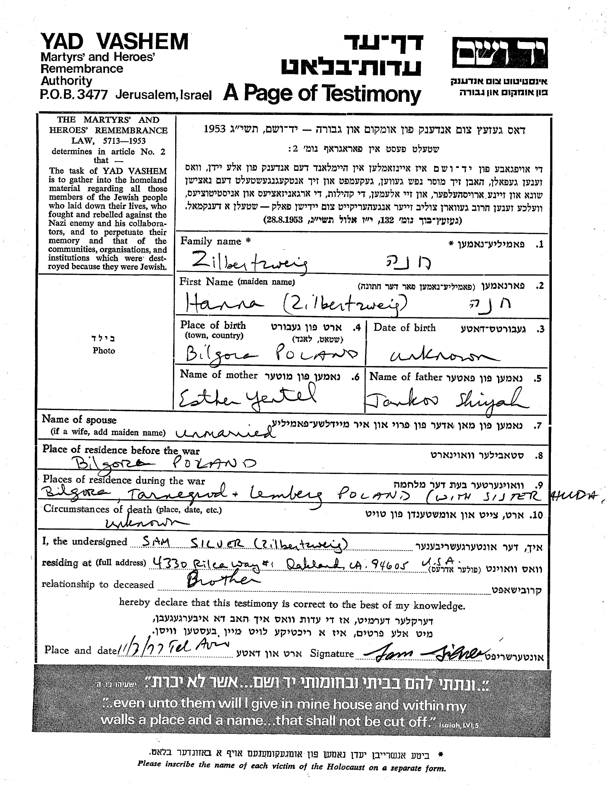 Hanna Zilbertzweig wurde in Bilgoraj, Polen geboren. Sie war die Tochter von Janko Shiyah und Esther Yentel. Sie war Ledig. Vor dem Zweiten Weltkrieg lebte sie in Bilgoraj, Polen. Während des Krieges war sie in Lemberg, Polen.