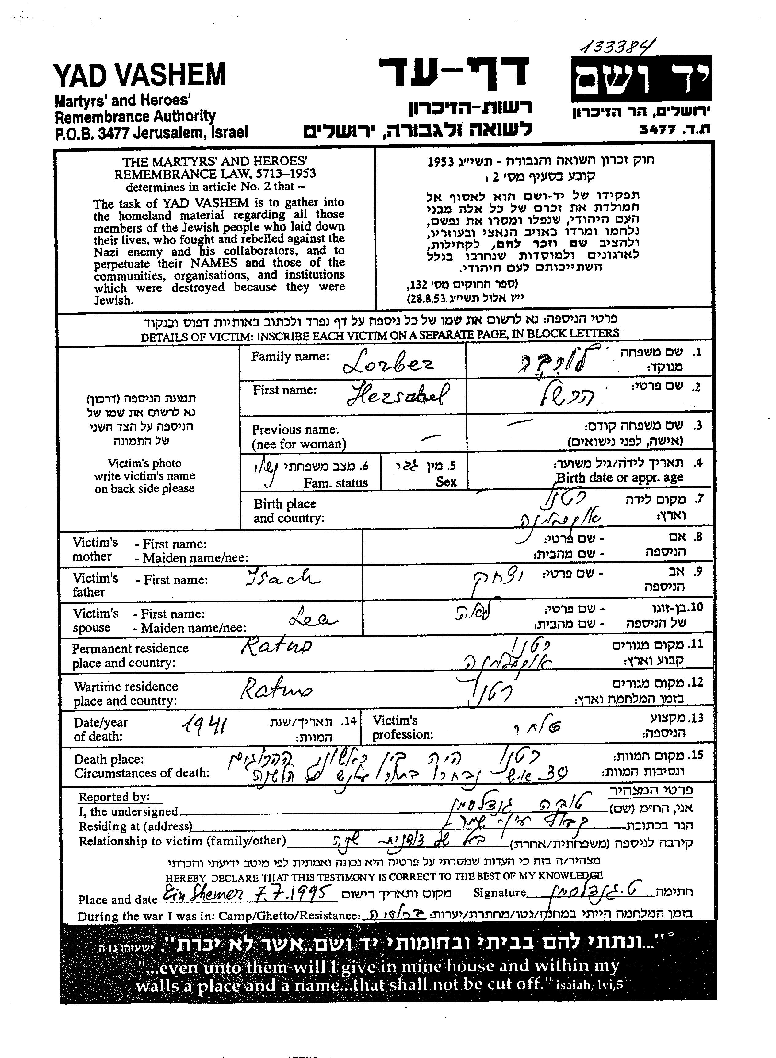 Herschel Lorber wurde in Ratno, Polen geboren. Er war Kaufmann/-frau. Vor dem Zweiten Weltkrieg lebte er in Ratno, Polen.