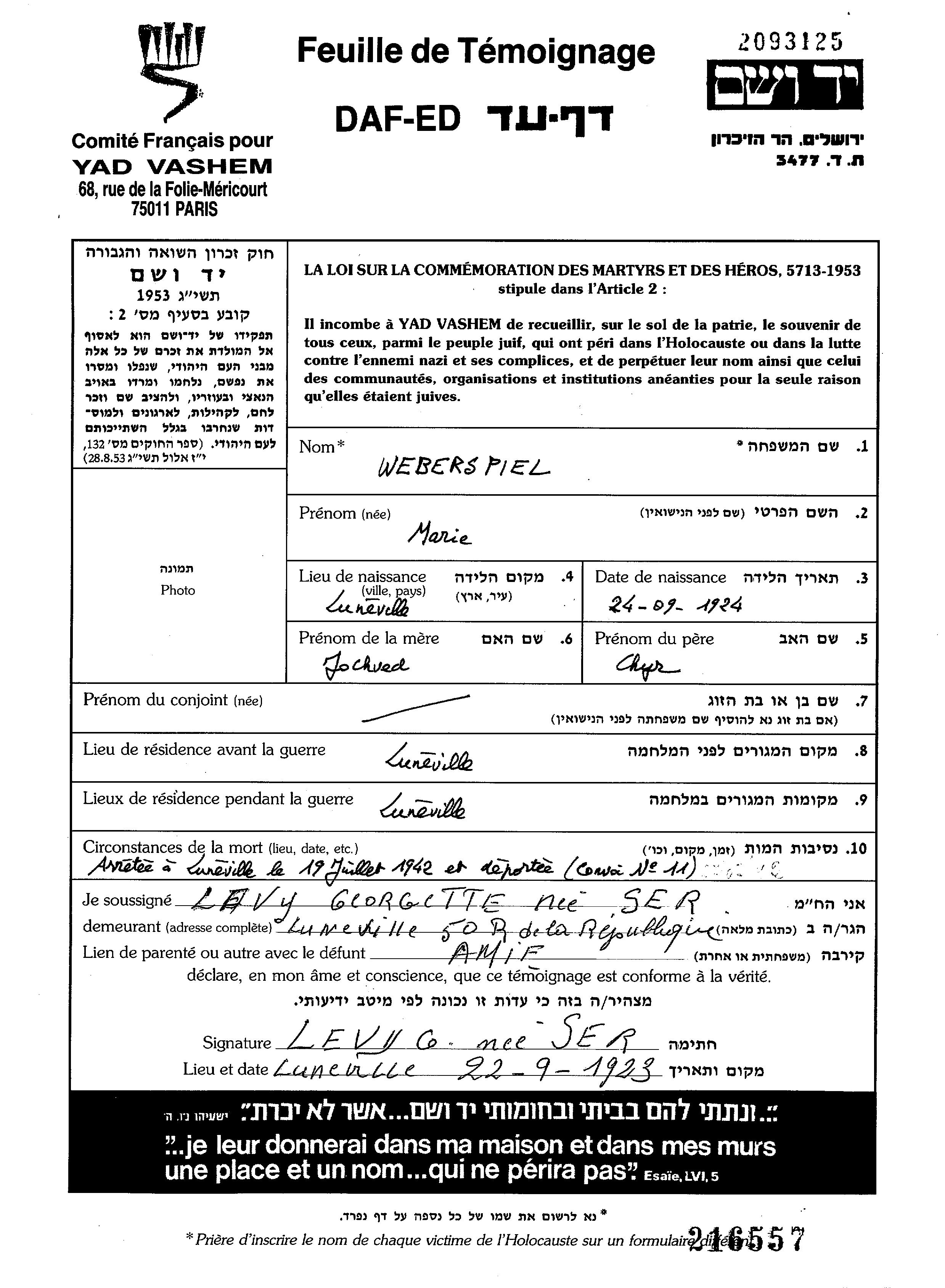 Weberspiel Marie 1924 Luneville, Frankreich Liste von Deportierten aus Frankreich
