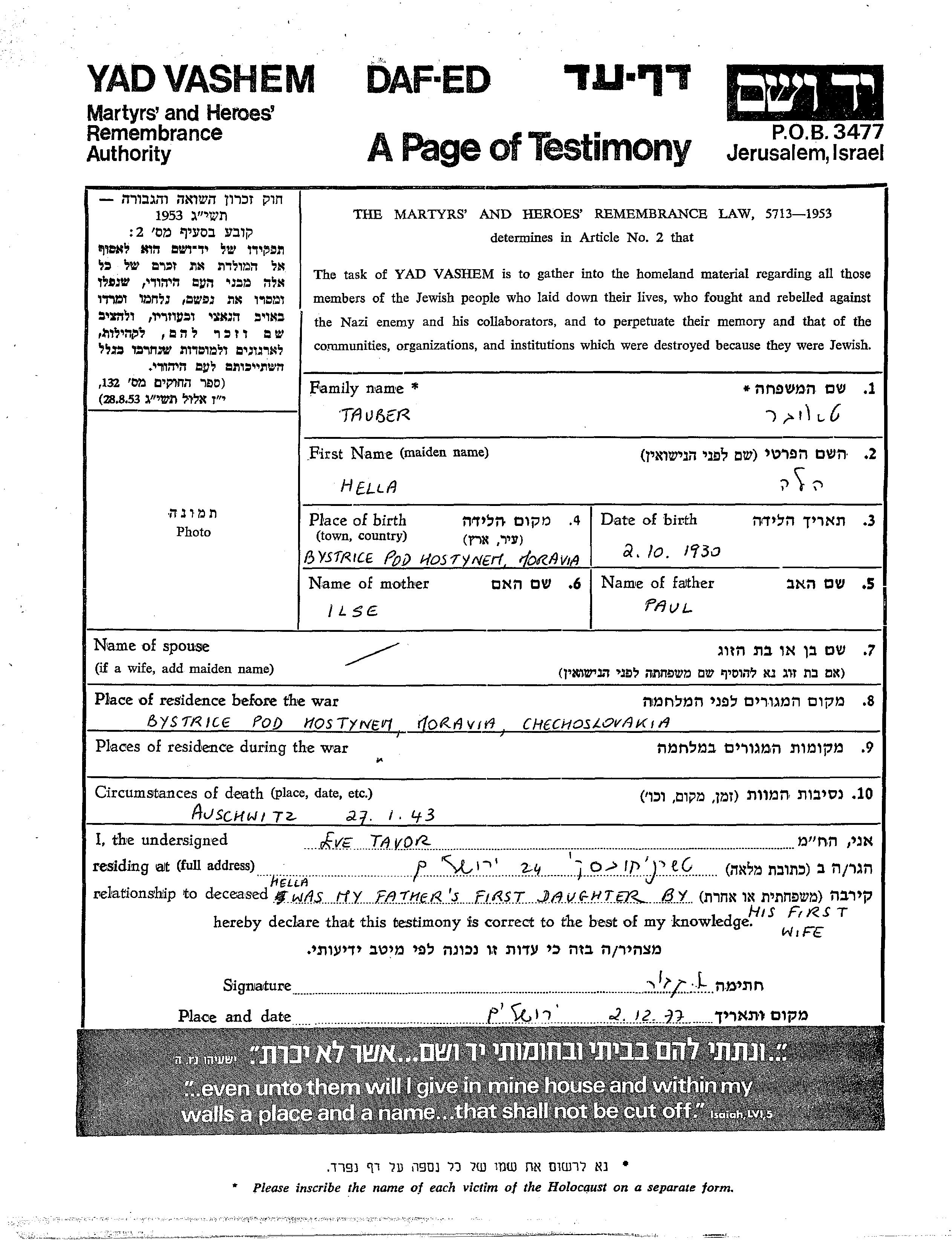 Hella Tauber wurde im Jahr 1930 in Bystrice pod Hostynem, Tschechoslowakei geboren. Sie war die Tochter von Paul und Ilse. Vor dem Zweiten Weltkrieg lebte sie in Bystrice pod Hostynem, Tschechoslowakei.