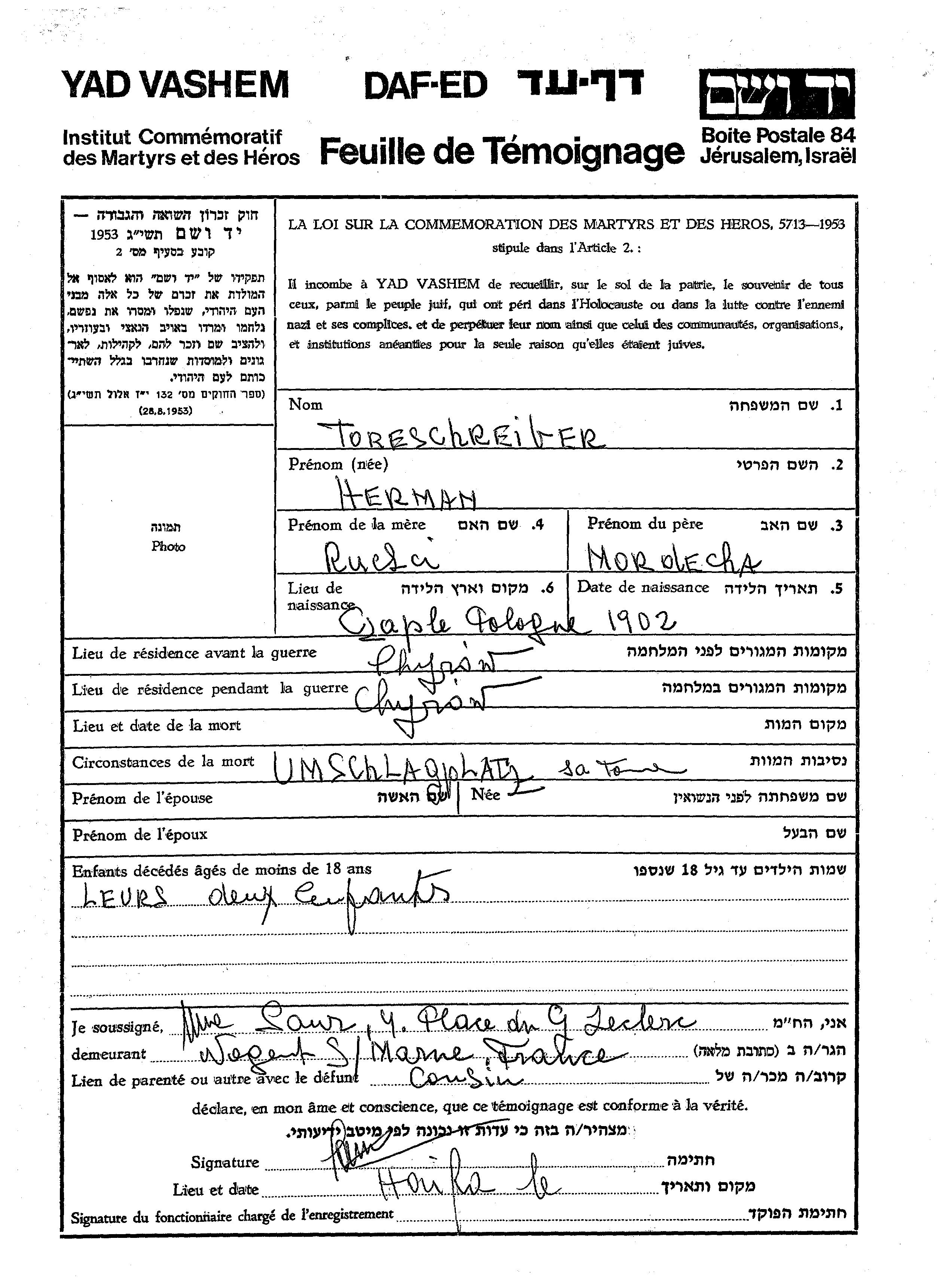 Herman Toreschreiger wurde im Jahr 1902 in Czaple, Polen geboren. Er war der Sohn von Mordecha und Rucla. Vor dem Zweiten Weltkrieg lebte er in Chyrów, Polen. Während des Krieges war er in Chyrów, Polen.