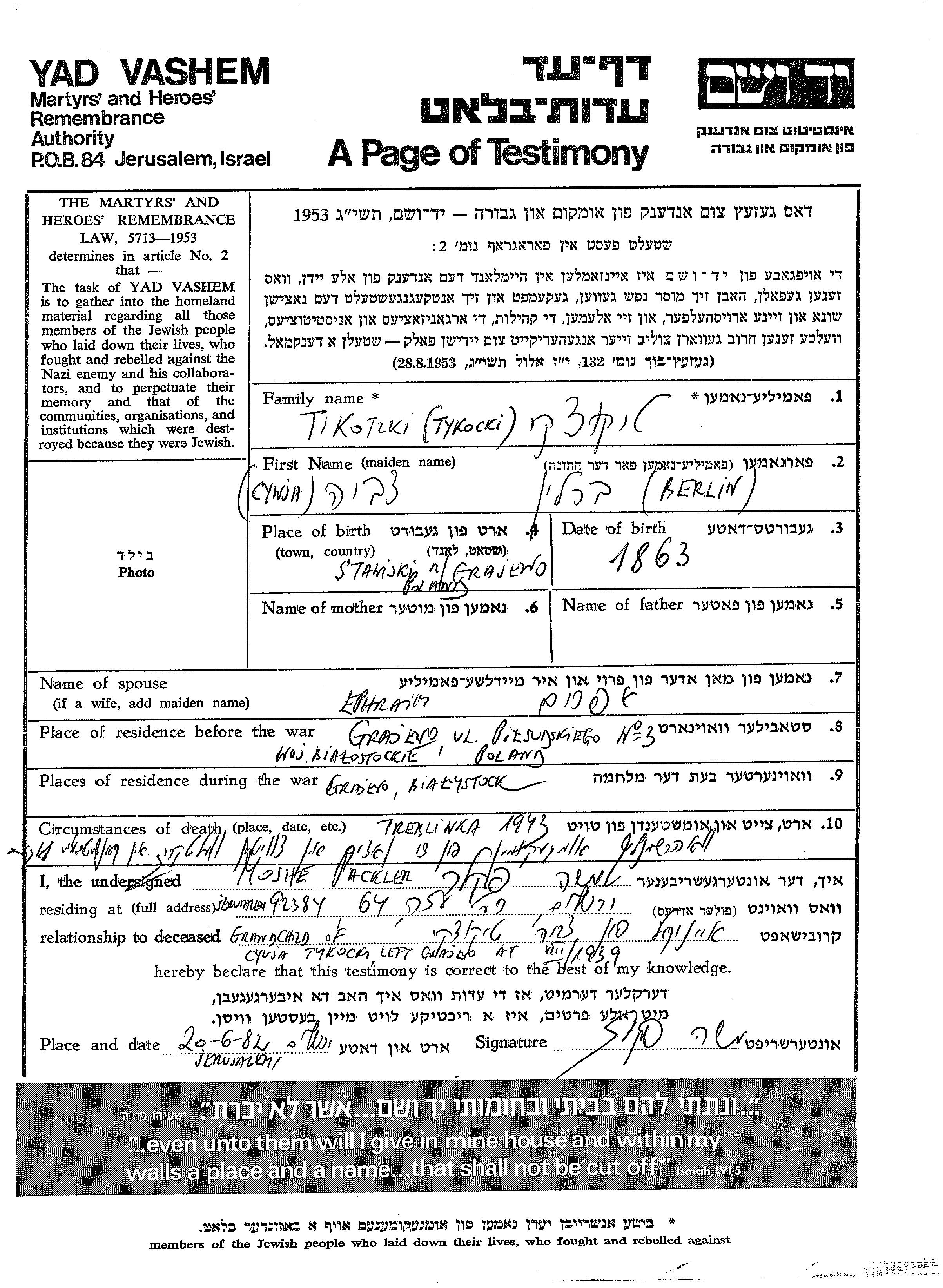 Cywia Tykocki, geb. Berlin wurde im Jahr 1863 in Stawiski, Polen geboren. Sie war mit Ephraim Verheiratet. Vor dem Zweiten Weltkrieg lebte sie in Grodno, Polen. Während des Krieges war sie in Bialystok, Polen.
