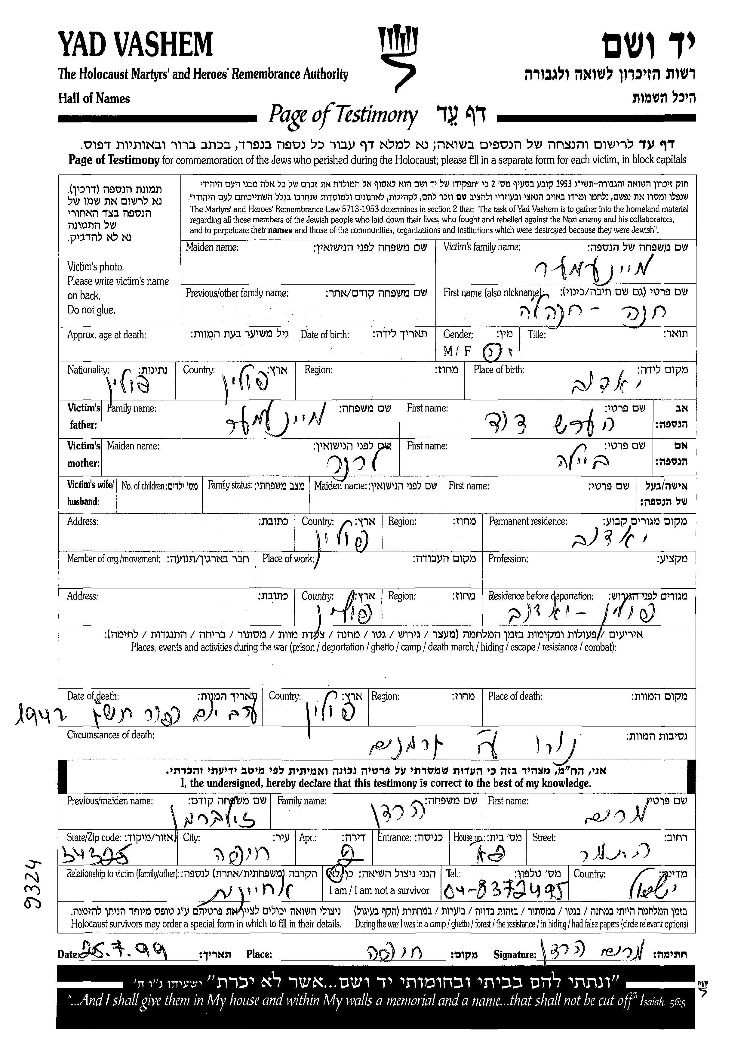 Mainemer Chana Jadow, Polen Liste ermordeter Juden aus Gedenkbuechern (Yizkor Books)
