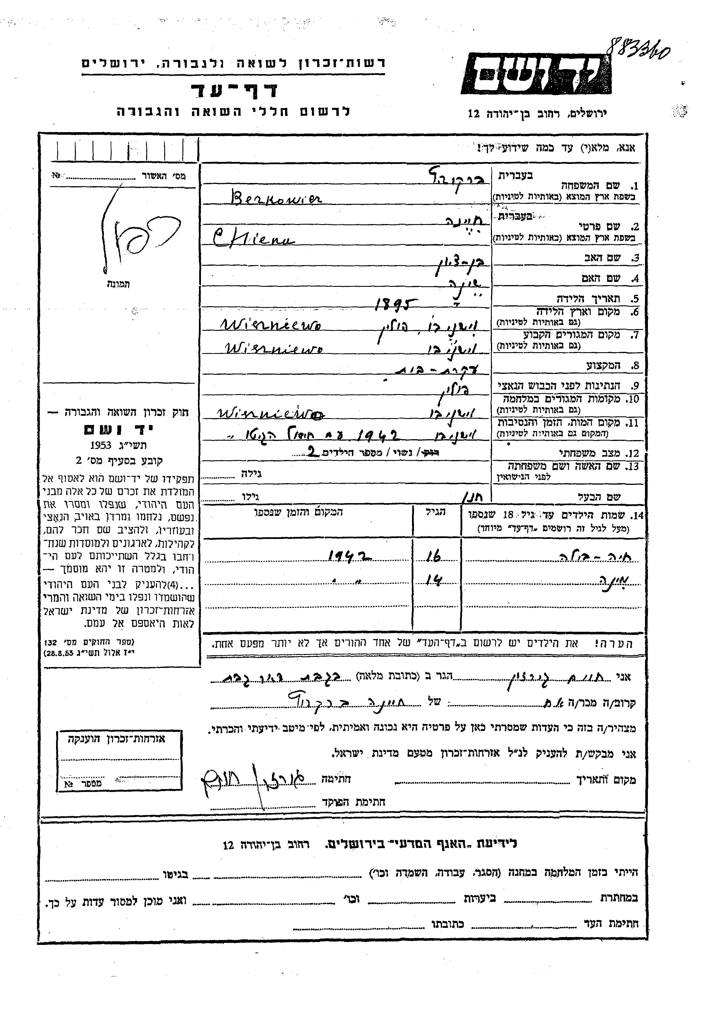 Chiena Berkowicz, geb. Girzon wurde im Jahr 1895 in Wiszniewo, Polen geboren. Sie war Hausfrau. Vor dem Zweiten Weltkrieg lebte sie in Wiszniewo, Polen.