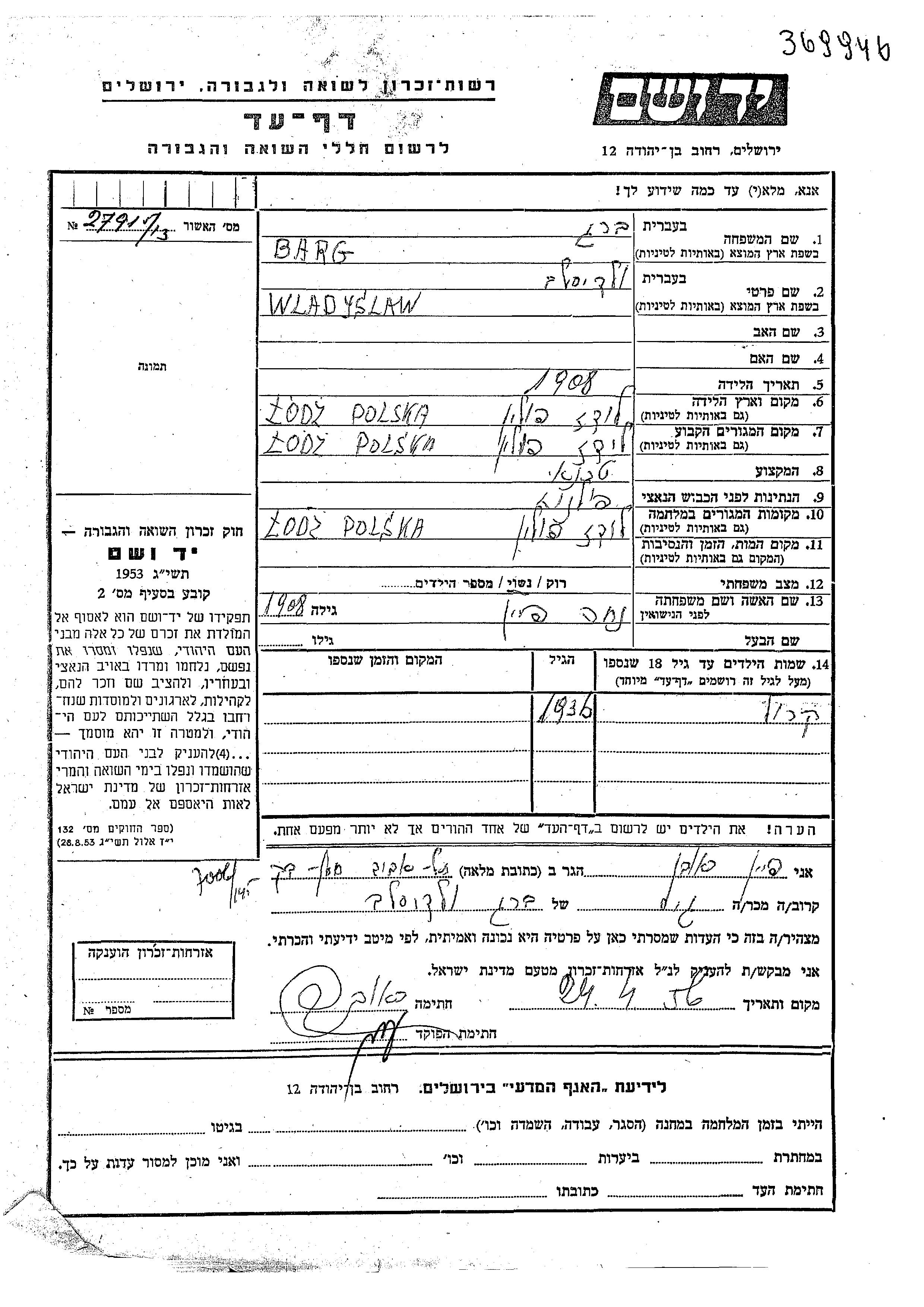 Barg | Wladyslaw | 1908 | Lodz, Polen | Liste von Bewohnern des Ghettos von Lodsch |