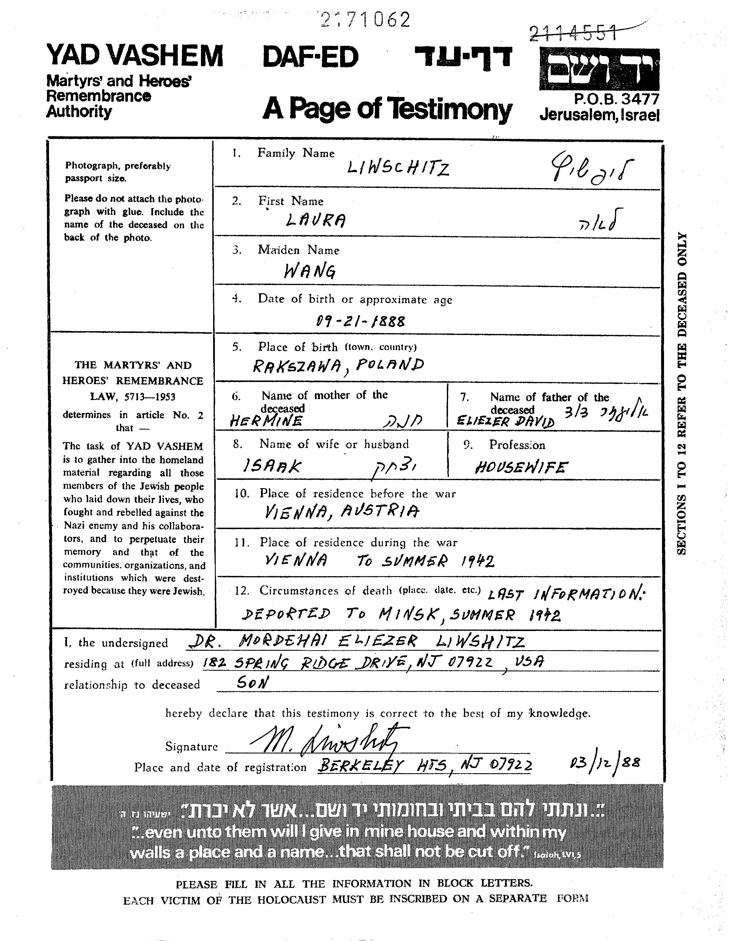 Lea Laura Liwschitz, geb. Wang wurde im Jahr 1888 in Rakszawa, Polen geboren. Sie war Hausfrau. Vor dem Zweiten Weltkrieg lebte sie in Wien, Österreich.
