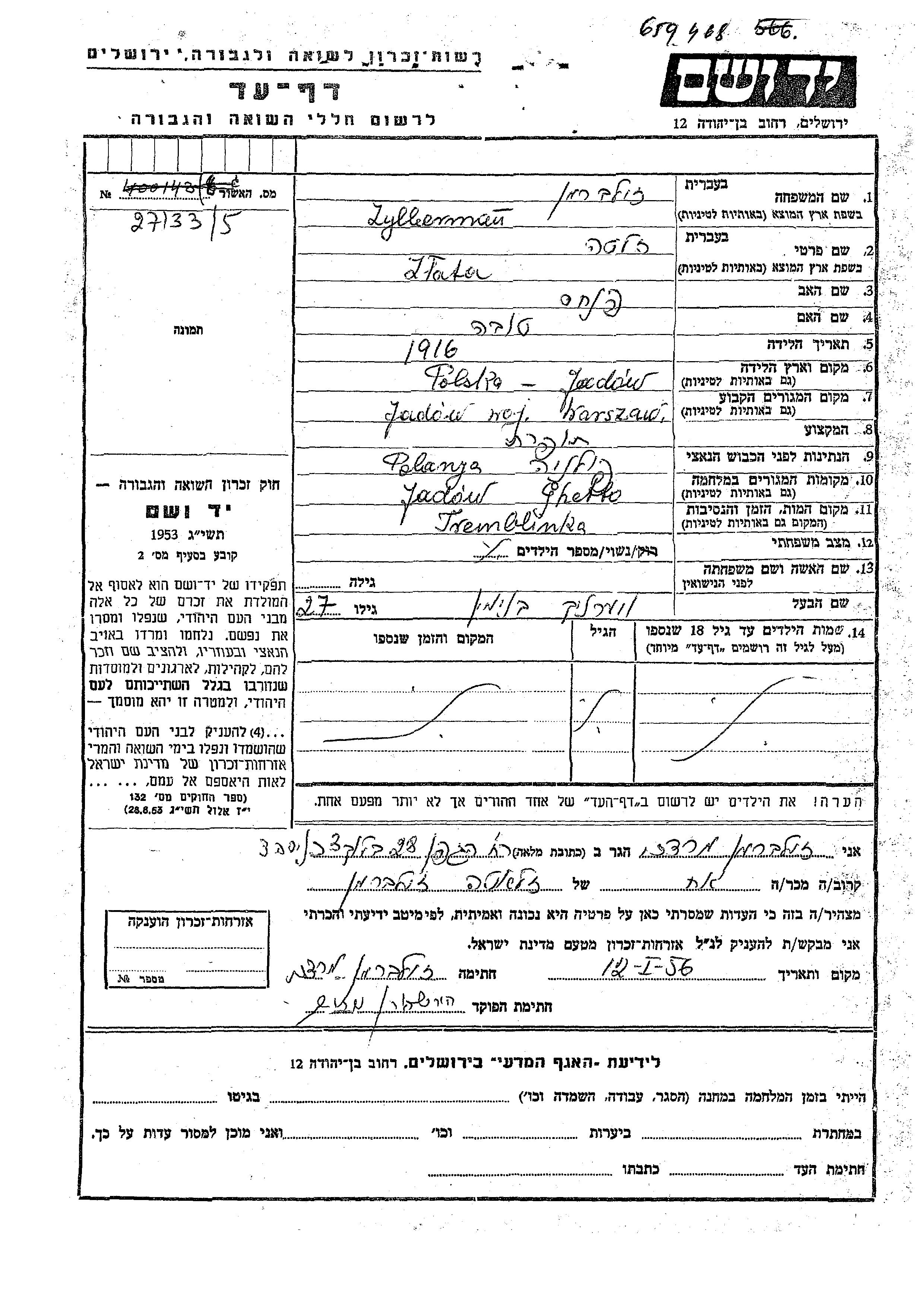 Zylberman Vernik Zlata 1916 Jadowo, Polen Gedenkblatt