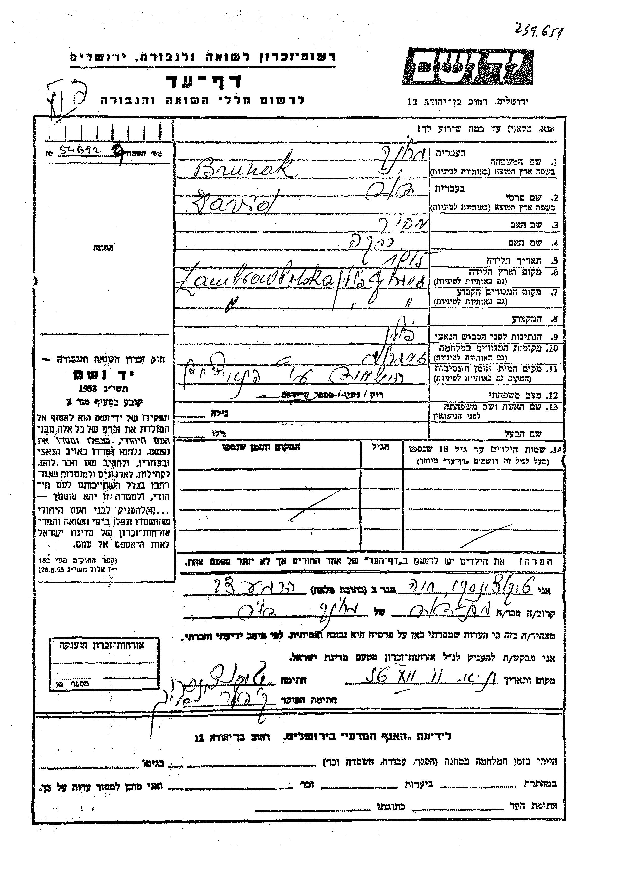 David Brunak wurde im Jahr 1915 geboren. Er war der Sohn von Meir und Rivka. Er war Ledig.
