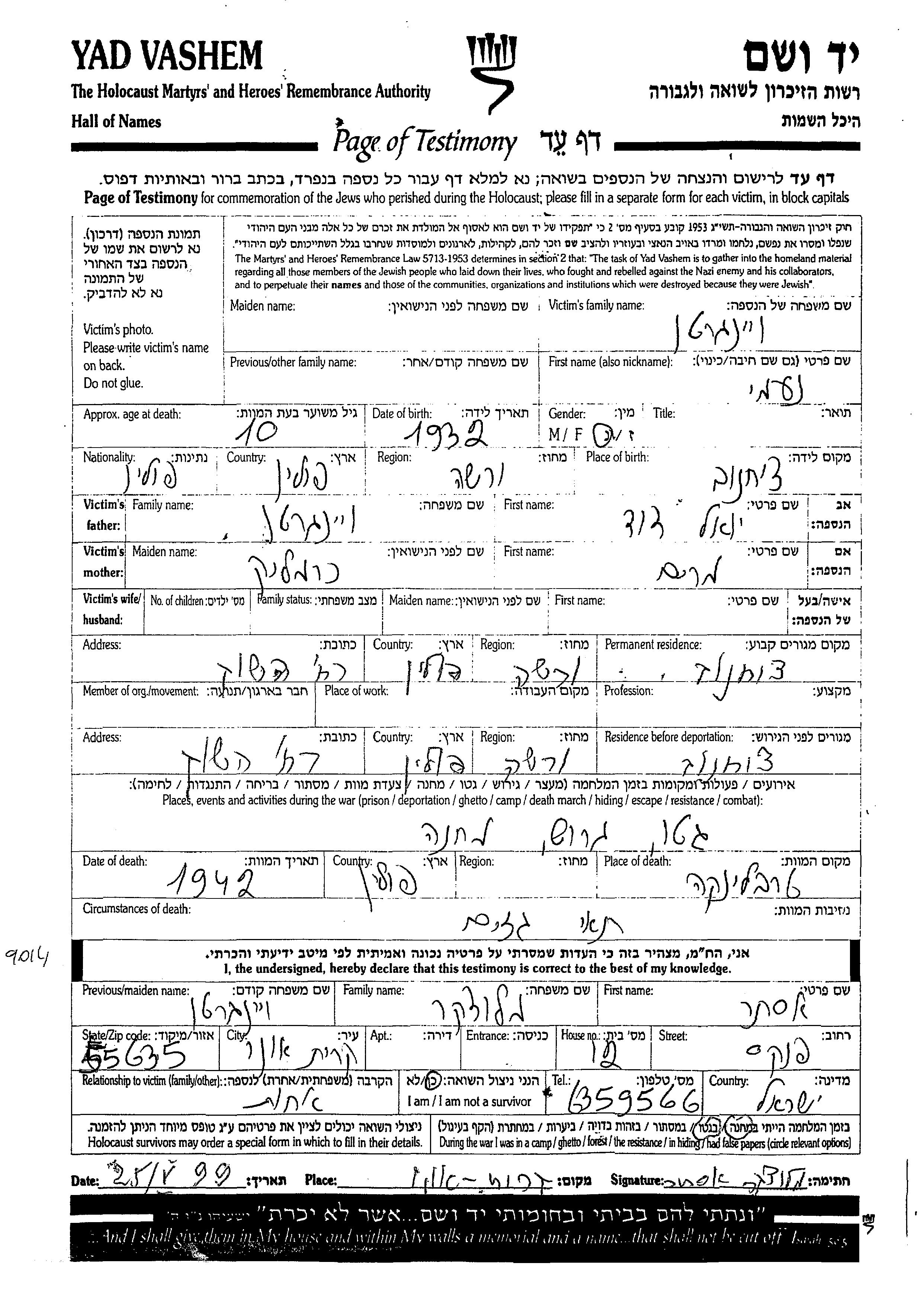 Wajngarten Naomi 1932 Ciechanow, Polen Gedenkblatt