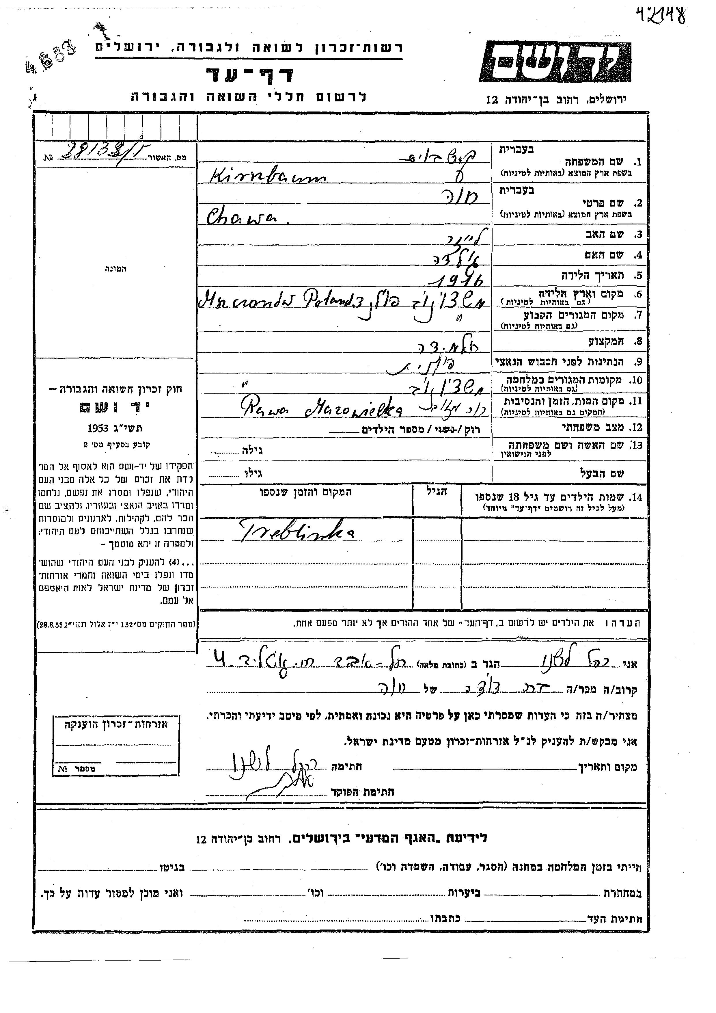 Chawa Kirsbam wurde im Jahr 1916 in Mszczonow, Polen geboren. Sie war Schüler/-in. Vor dem Zweiten Weltkrieg lebte sie in Mszczonow, Polen.