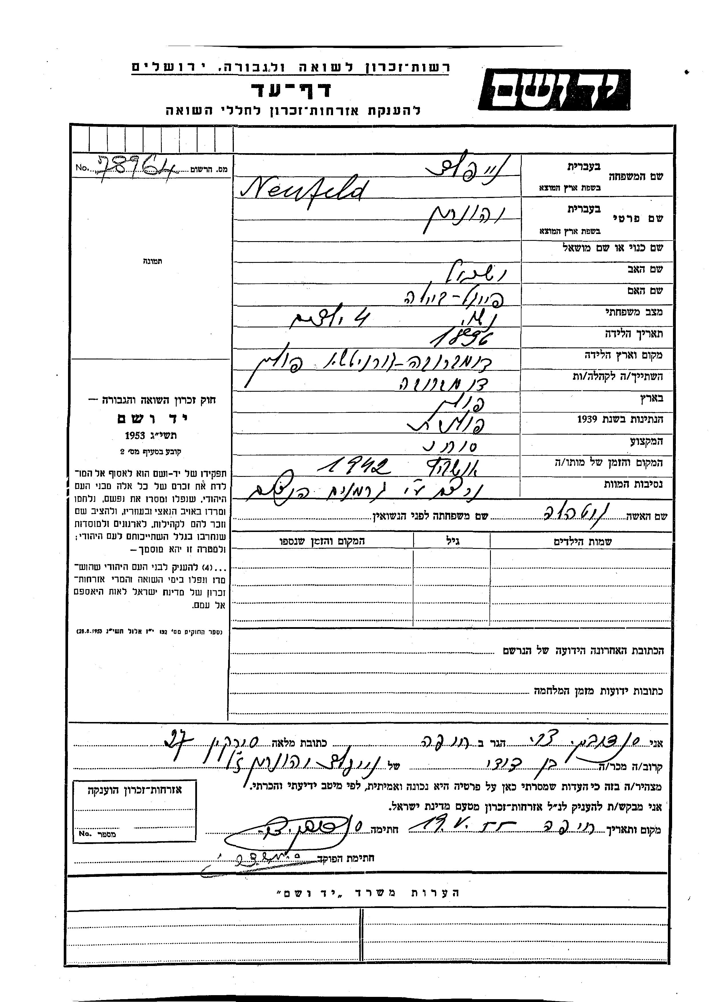 Jehonatan Neufeld wurde im Jahr 1896 in Dabrowa Gornicza, Polen geboren. Er war der Sohn von Yisrael und Feigel Beila. Er war Kaufmann/-frau. Vor dem Zweiten Weltkrieg lebte er in Dabrowa Gornicza, Polen.