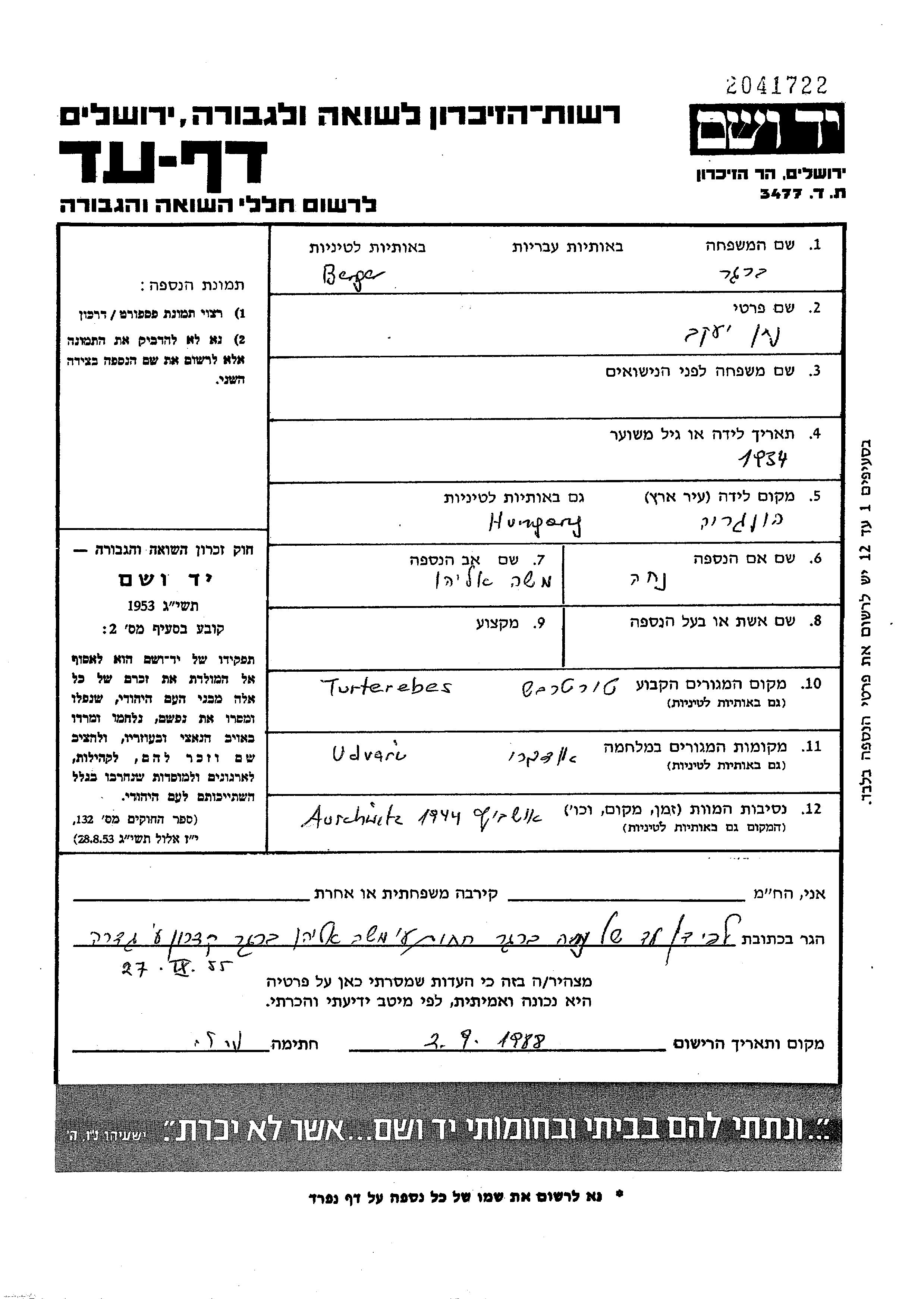 Berger Natan Yaakov 1934 Turterebes, Rumänien Gedenkblatt
